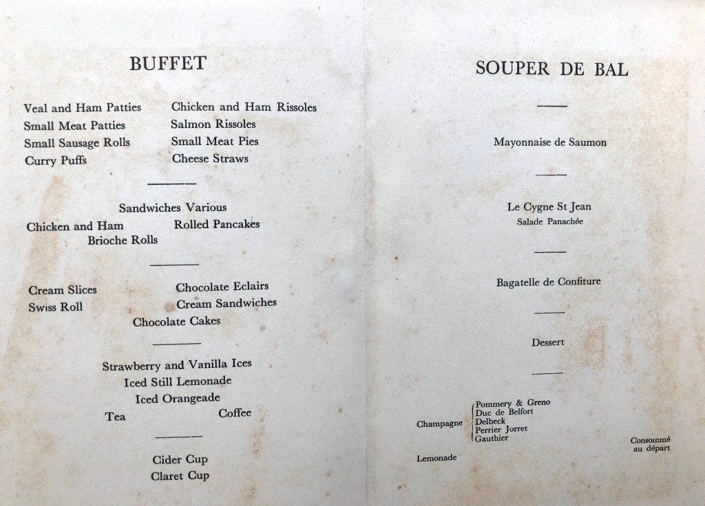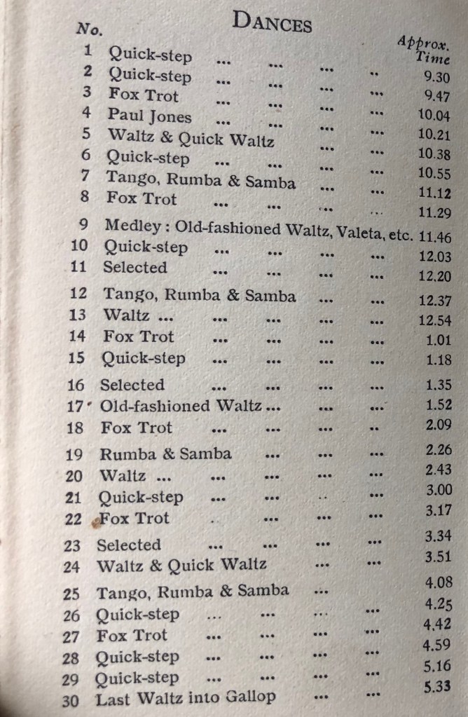 Party of 10: Cec took the picture, and as the dance card shows, they could dance from 9:30 p.m. until the ‘Last Waltz into Gallop’ at 5:33 a.m. There were 5 different Supper times to choose from (11:30-3:30) and a Buffet to sustain them until then.