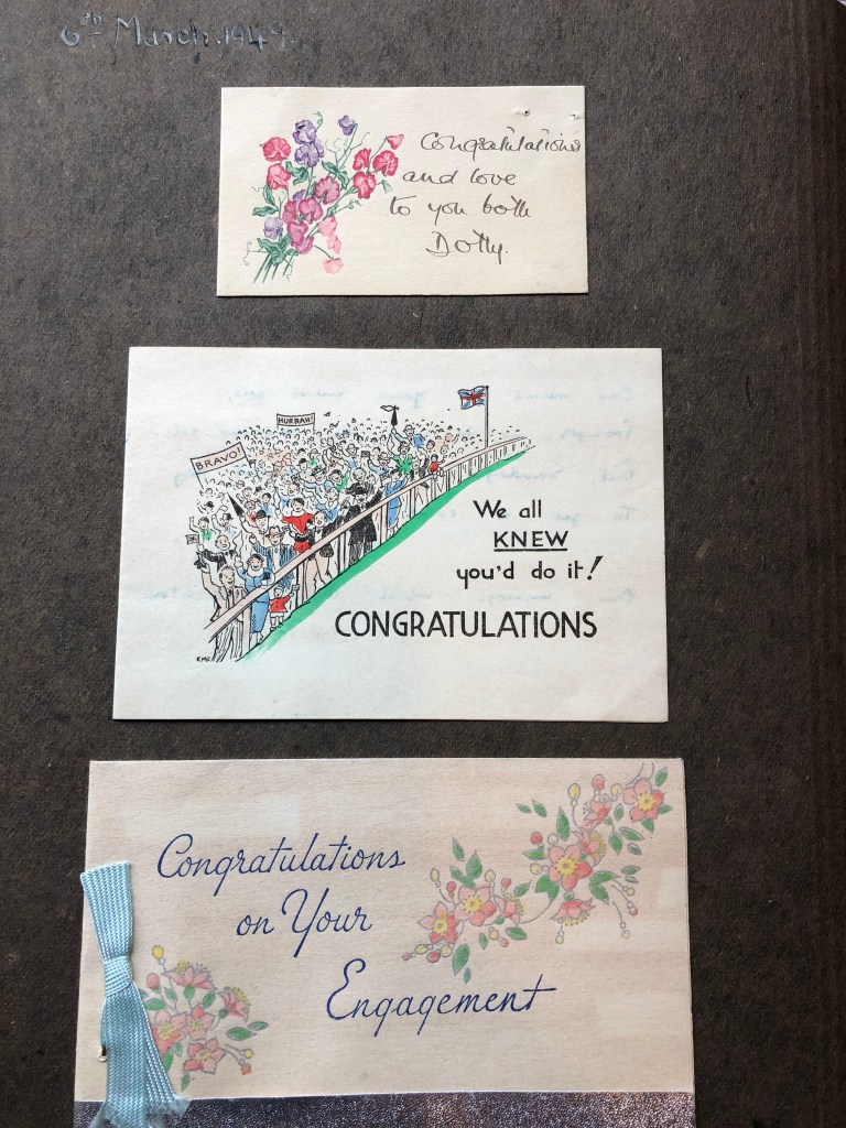 Cyn and Cec announced their engagement on March 6th, as recorded in their first scrapbook. There are cards of congratulations from their friends, including an original poem, and telegrams from Cyn and Carol’s friends further away in England: Anne and Tadek, Nancy and Dick, Pam, Maud Allan, Irene and Bill, and Mrs Sheedy and Denis.