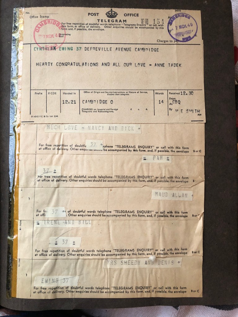 Cyn and Cec had met each other’s friends in Cambridge in the year since they had met, but the Easter holidays gave them a chance to branch out, meet friends outside of Cambridge, and enjoy the theatre, one of Cyn’s favourite things. The picture in the scrapbook for Easter 1949 above features baby Nigel, 4 months. In London, they would have spent time with Jessie and Norman Aldridge and their little girls, where Cyn had an important question to ask- would Jessie’s 6-year-old daughter Zinnia be her flower girl in July? With clothes coupons still needed, this was quite a demand but Jessie and Zinnia agreed!