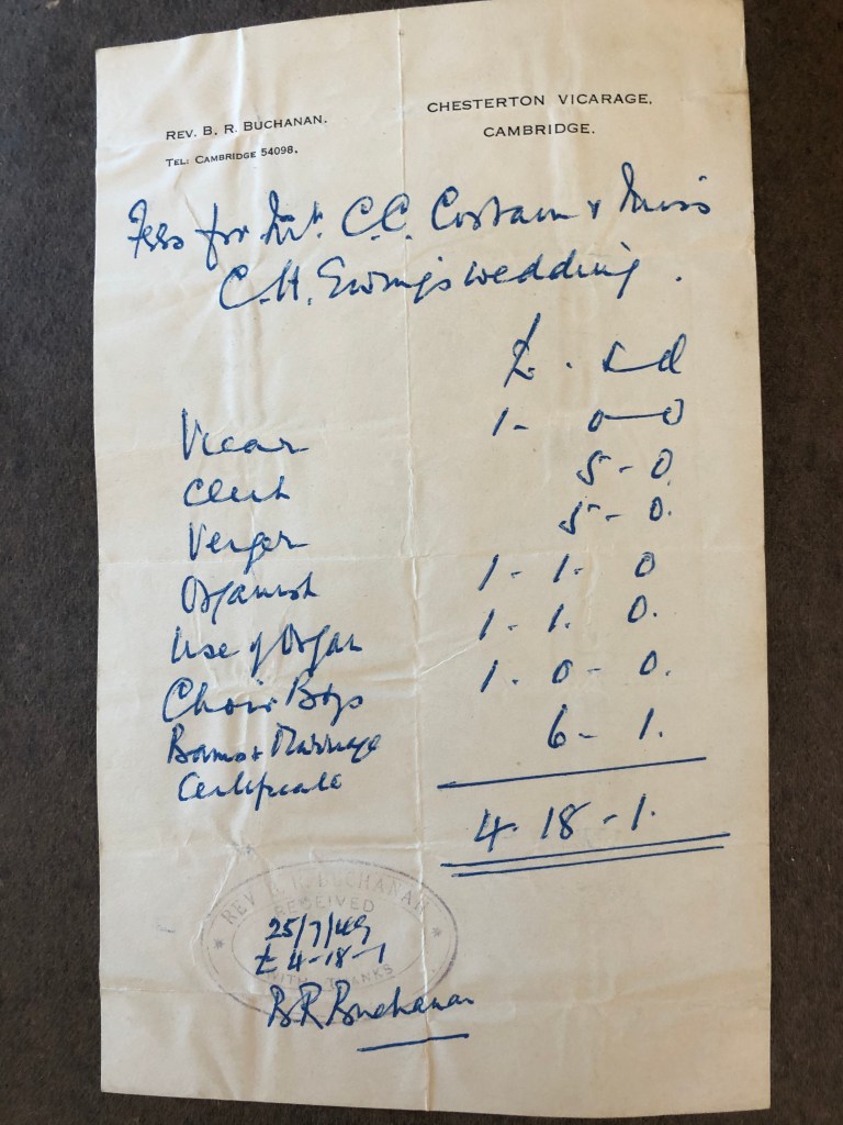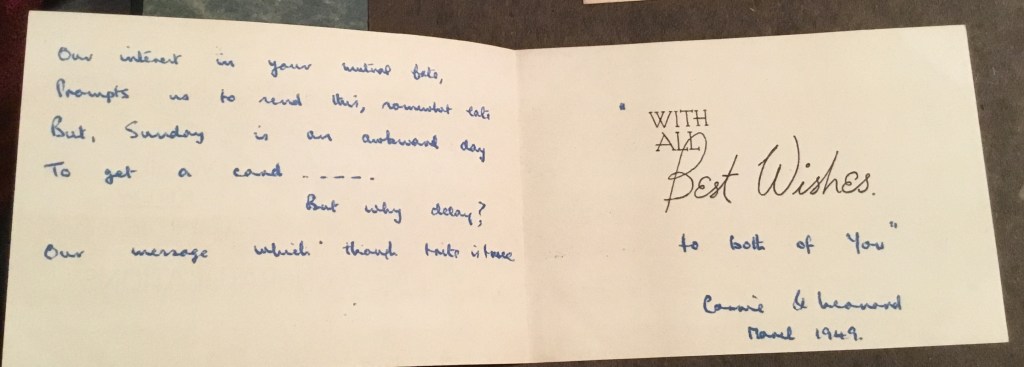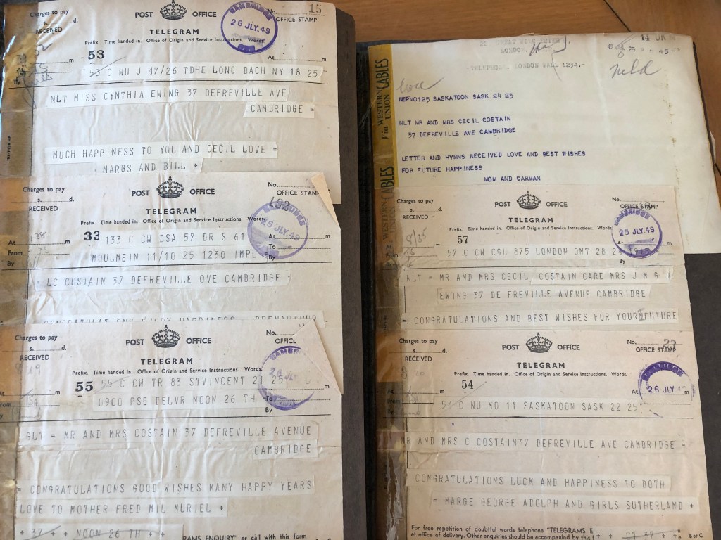 Cyn and Cec got engaged at the beginning of March 1949, and planned and booked their wedding for July 26th, 1949, at 2:30. The March letter suggests the wedding invitations had already been sent out, and Cec’s friends in England were responding to them.