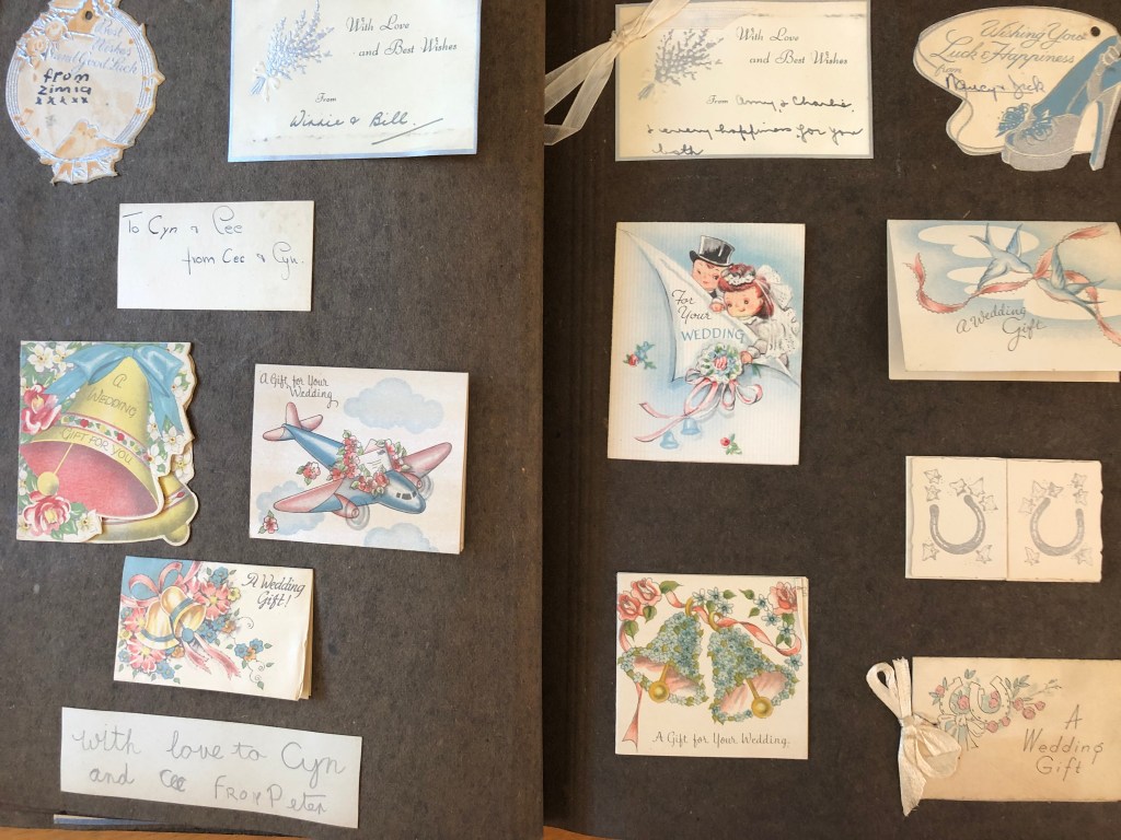 Three pages, finishing with handwritten additions, from presents they received once they got to America.Cards that accompanied the wedding presents.