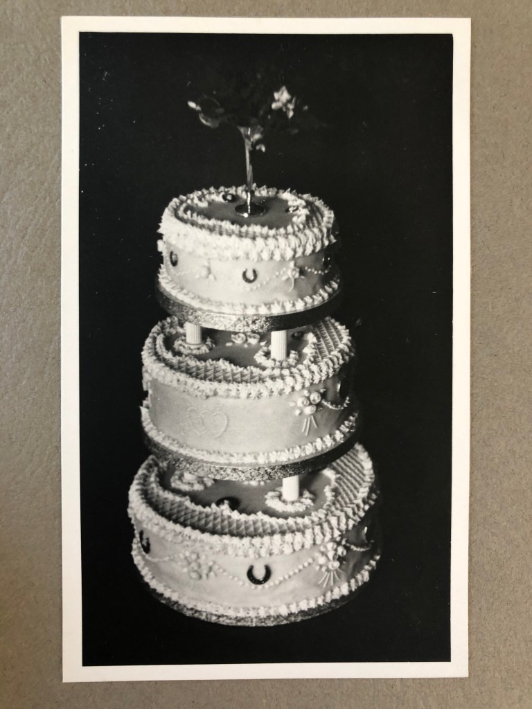 With rationing still in existence in England, the difficulty of obtaining suitable ingredients for the traditional fruit cake was overcome by asking her Auntie Muriel in St Vincent, who had sent them a Christmas cake in December, to send the cake made already, for her to decorate. It arrived from St Vincent, soldered into tin containers, and Cec was called upon to open the tins. The three tiers emerged, solid with fruit and preserved with lots of good West Indian rum! A fruit cake is traditionally topped with a layer of marzipan paste and then iced with white royal icing that hardens, then is decorated. Cyn covered the three tiers with the marzipan and smooth icing and allowed it to harden overnight before starting on the decorations. But in the morning she discovered that the rum-soaked cake was bleeding through and discolouring the white surface. A thicker layer, preferably done at the last minute, was required. This worked, and the intricate lattice work, flowers, and appliqués of lucky silver horseshoes was completed. Assembly had to follow, before the final piping of rosettes around the pillars for a finished look. But when the pillars were set upon the cake, and the heavy next layer balanced on them, they began to sink! Cyn and Cec hastened to disassemble before irreparable damage was done, and Cec was forced to sacrifice candles the size of the pillars, carefully core out the cake, and insert the candles as firm supports for each of the upper tiers. Then Cyn could finish her piping and on the morning of the wedding day, add the silver vase on the top, filled with fresh flowers. Cec, who had sampled the cores he’d removed from the cake, suggested the guests would get tiddily from merely consuming a slice…