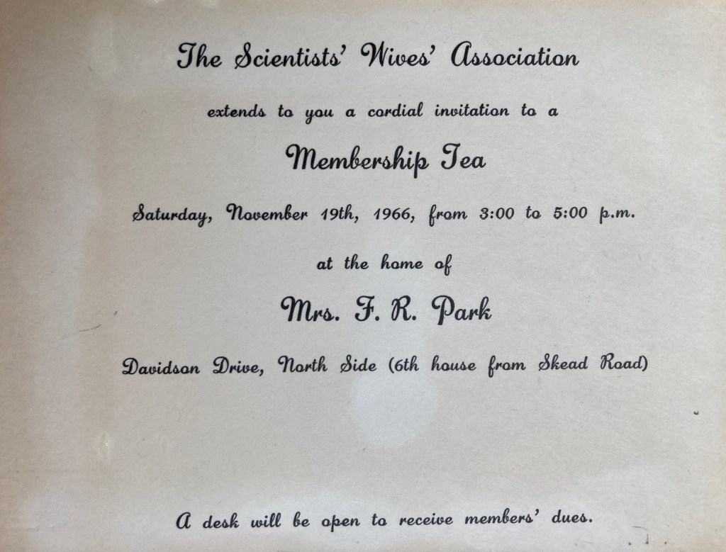 … took our tickets to the Little Theatre and went to see the “Centennial Play” particularly written for Canada’s birthday, while we stayed home and chatted to Merle. We had not had good reports of the play so we weren’t a bit sorry to miss it but the girls quite enjoyed it and Linda was intrigued because Jean Craven was acting in it. On Sat. I had a small dinner party with a Dr. Trembetti from Italy who is at the Lab. for 2 years, a young couple, Dr. and Mrs. Englemann, from the U.S. Atomic Lab. at Los Alamos, New Mexico and Mr. Graham, and we had great fun. I had invited Phyl Douglas too as Alex is in India, but she couldn’t come. Her Mother has been failing quite badly lately – she is blind and a bit deaf as you know and had the broken leg, but she also has been having heart attacks and has to be rushed into oxygen at the hospital, and about 10 days ago this happened again and Phyl didn’t think that she could possibly last long. She couldn’t keep anything down and was sort of semi-conscious all the time in the oxygen tent. I haven’t liked to phone Phyl too much as she has been spending nearly all her time at the hospital, but so far Mrs. Wright must be still alive as I have been watching the papers. It is so sad as Phyl says each breath is such a struggle and she feels that it is so hard for her. I must stop now as I have so many letters to write. Please tell Auntie Muriel thank you for the letter and that I will be writing soon. I will write again soon to you and answer your letters now that I have at last caught up on our Christmas activities. I have bought 2 gorgeous lengths of material with your Christmas money and have had my sewing machine fixed, so I am longing to get sewing. I will send you little bits of the material later.
