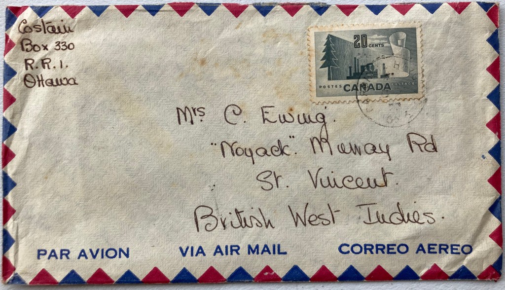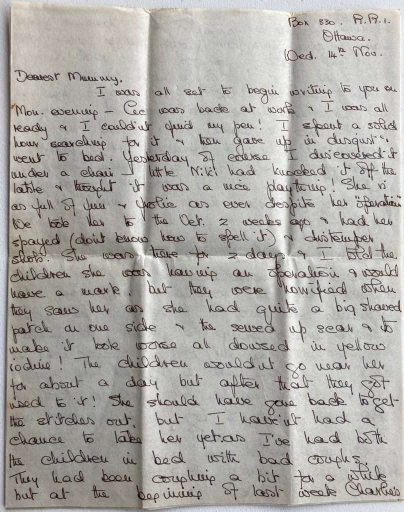 You’ll be glad to hear I got a girdle to wear with it, but I was cunning – I got a nice big size, so it doesn’t slay me! The dress looked quite nice when it was finished & made me look taller as the stripes go up & down, but of course I had the usual trouble with the pattern not being an exact fit & having to make it shorter waisted etc. – such a pest! The Spectroscopy Party was on the Friday & it was very nice – quite talky- talky Cec said, but I never mind that! It was held in a house on the Driveway which is now an RCAF Mess & was very comfortable & pleasant & there was dancing, but most people just chatted – a very sober crowd! Linda was home 2 days that week with swollen glands under her chin! She had quite a puffy swelling & the Dr. said to put on hot fomentations which I did & they gradually disappeared. She was feeling fine & full of high spirits all the time, but it was amazing at the party, nearly everyone had sick children at home. It has been such a fall & early winter for colds & sickness.