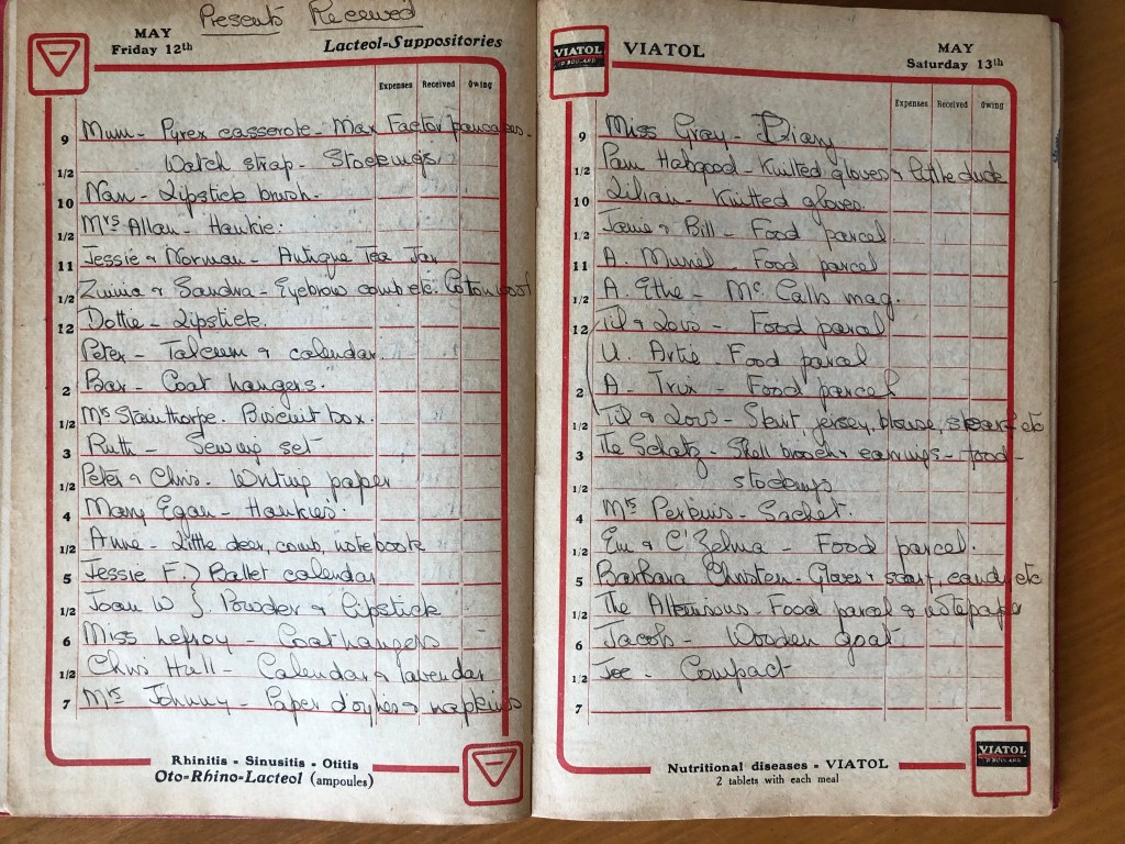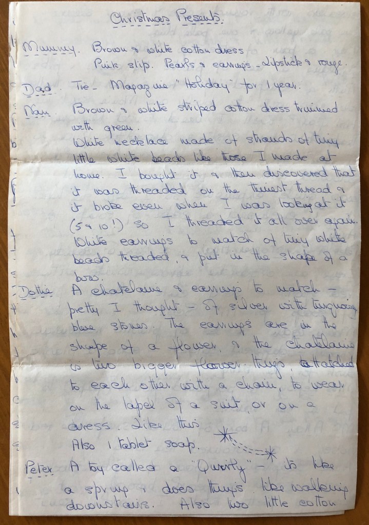 While Christmas 1947 approaches, I thought we could look at the very organized records Cyn kept of her purchases and gifts, which her letters from America showed were very important to her. I think some of the things listed above that Cyn brought for her friends from the States in August 1947 were scarcities in England such as the stockings, and had been arranged and paid for by the recipients, but she seems to have brought something for everyone mentioned in her letters, so perhaps not.