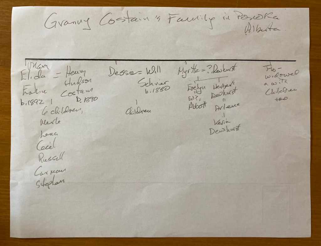 It is the premise of this blog that in the twentieth century LETTERS kept a wide-flung family together. Cynthia and the women of the family on the Hazell side did write letters and keep in touch with the day-to-day events of their lives, probably because they had done this in previous generations- the colonial outposts of the empire looked to England and the family was wealthy enough to have the leisure to write at length, and visit, even in different countries. I’m not sure that this was true for farmer families in North America, who moved across the continent in the hopes of a better life for their children, and who lived in a different economic bracket. Elida Eakin was born in Nebraska but must have moved in the 1890s or 1900s, because she and her immediate family lived in Ponoka, Alberta, in Canada, where her first 3 children were born. Her husband, Henry Costain, moved from Prince Edward Island where he had grown up, to the West before World War 1, and married and lived in Ponoka before moving his family to Saskatoon, Saskatchewan in the 1920s. Elida kept in touch with her immediate family in Ponoka, Henry with his, but the familiarity with the more extended members of his Costain family in P.E.I. was lost- something that wouldn’t have happened if he had continued living there and had bumped into distant cousins as one does in a small community.