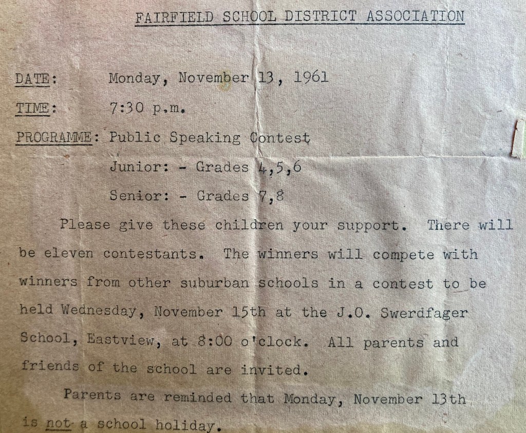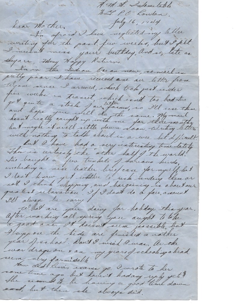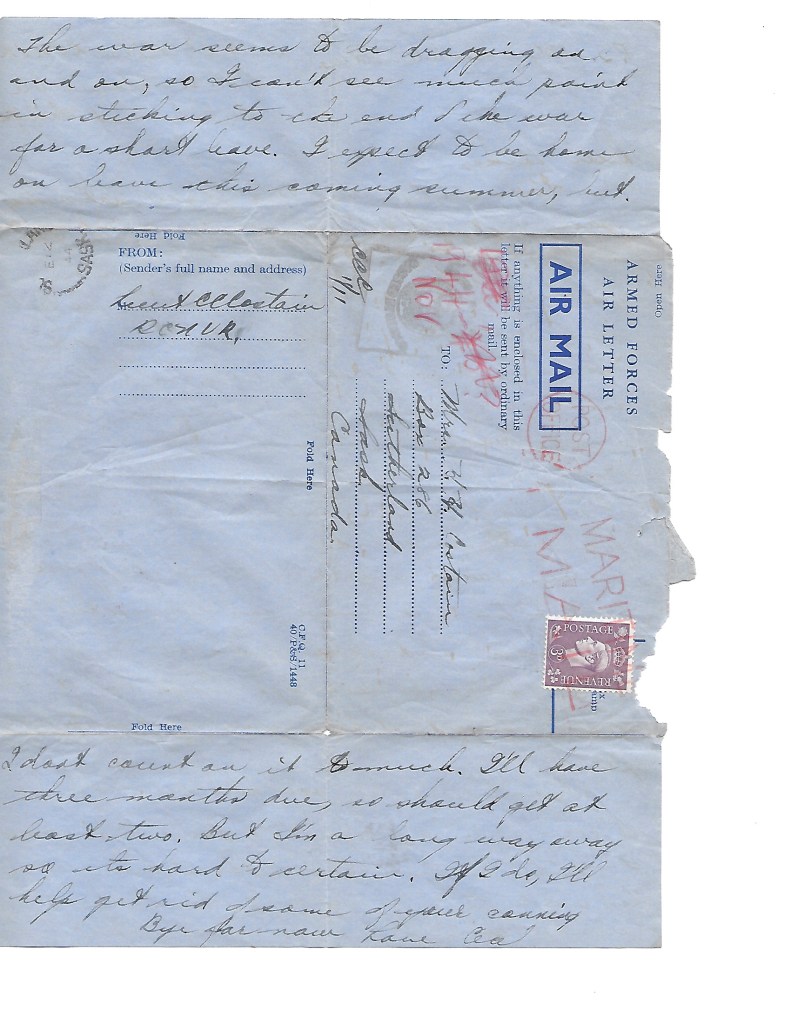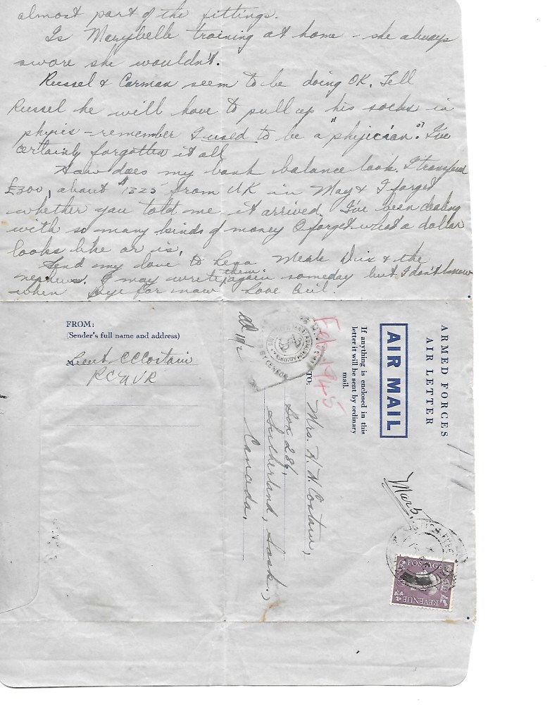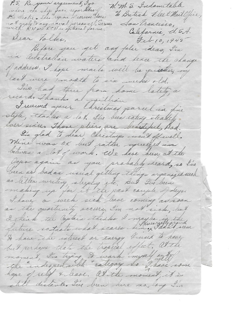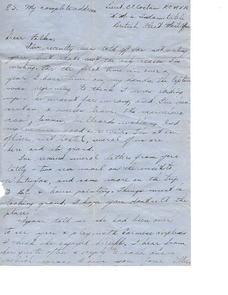 I would not normally include the children’s work in these letters but this speech addresses Cec’s war experience, one of the few times we, as children, ever heard him talk about it. There was a picture of the H.M.S. Indomitable on the wall, some musty smelling epaulettes and a hat with a tropical white cover in the basement, and that was all we knew. In fact, until my husband and I visited 30 years later, I had never known him to tell anyone details about his service- and he didn’t talk to me, but to Pat. There certainly was a lot of parental input into our speeches- Linda’s was based on one of Carol’s childhood experiences, as told by Cyn- but given that this was all happening while Cyn was in hospital and then home recovering, Charlie’s success was a commendable effort!