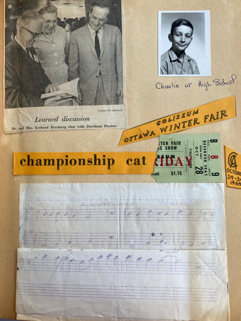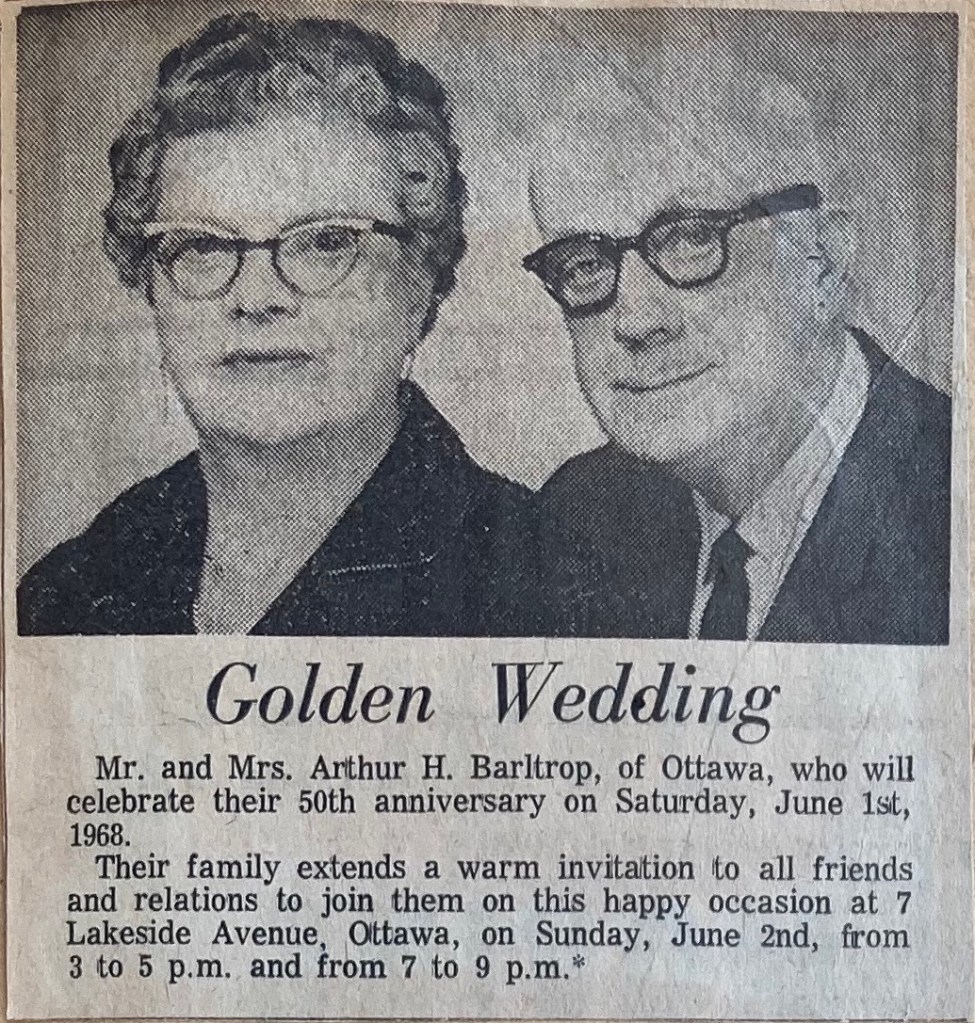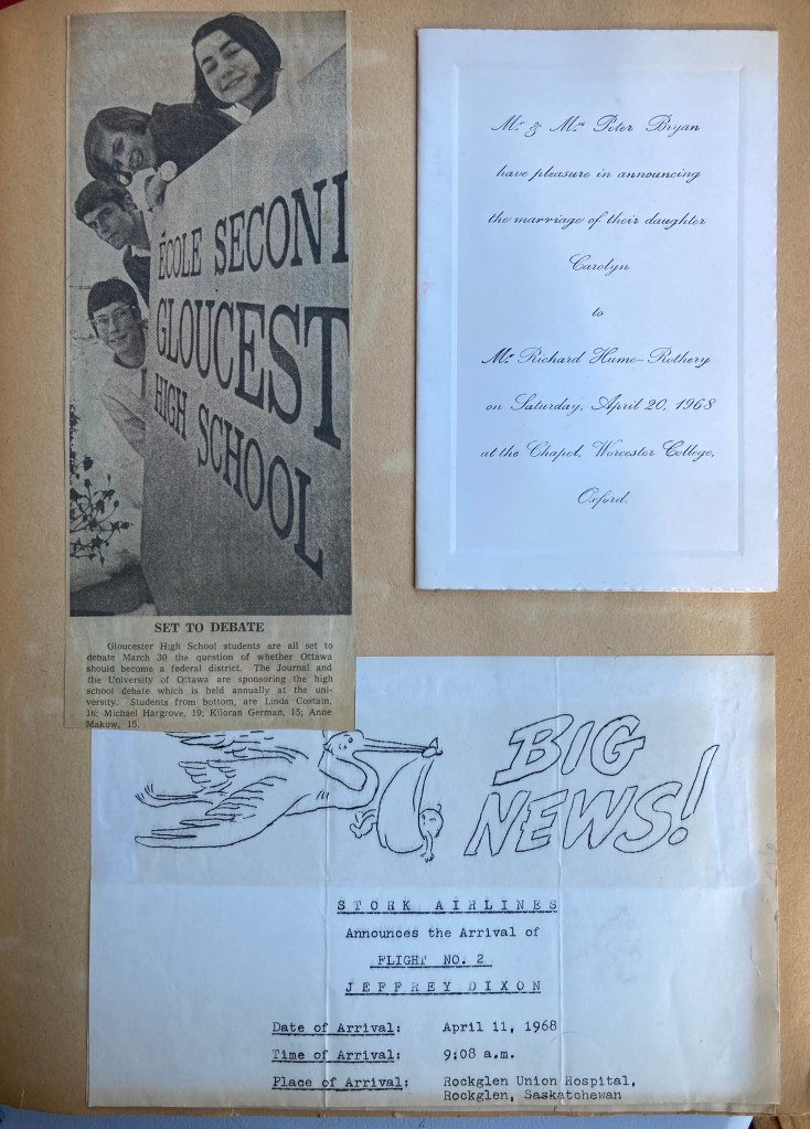 This April letter tells Carol about the activities of the Costain family in the spring of 1968, and so combined with the scrapbook, enables me to cover the summer too. Although just mentioned in passing, Cyn gives an idea of the children’s involvement in activities that would later become part of their adult lives. Linda belonged to the Debating Club- even in a school of 2000, limited appeal led to a membership of about 10 students- (not that she grew into a speech-making politician, but I’m fairly sure any teacher can address a crowd at the drop of a hat), and enjoyed helping with amateur plays. Charlie participated in the Miles for Millions fundraiser each year from this point on, which foreshadowed his adult marathons and biking tours. The whole family was interested in the political change in Canada, and the events of 1968 were world-shaking enough to ensure that the Costain teens would keep an eye on current events for the rest of their lives. The scrapbook shows pictures of the Golden Wedding the Women’s Auxiliary of the church were helping to celebrate- but not a photo of the cake that Cyn decorated for it!- and the announcements of a Hazell wedding and a new Costain cousin, Jeff Moor.