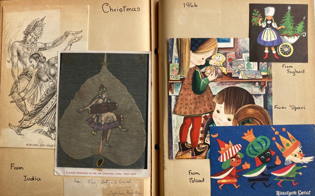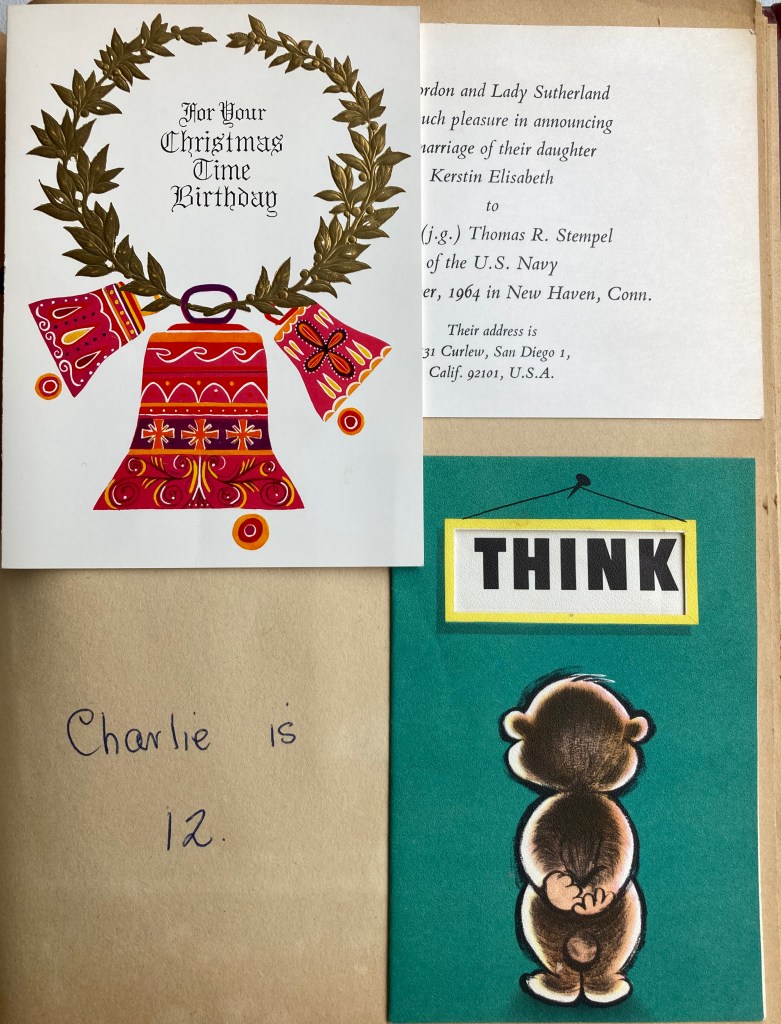 In December, the Christmas routine began again, with the card list now about 150 strong because of Cec’s travels and scientific contacts, and Cyn’s scrapbook reflects this, with cards from all over- India, Spain, Poland, as well as England. Of course news from friends came too, and a card from the Sutherlands- Dr Sutherland had been knighted in 1960, and this year, 1964, had become the Master of Emmanuel College, Cambridge- included Kerstin’s wedding announcement with the news that they would be moving to San Diego. (Cyn and Cec realized the days when they babysat the Sutherland girls in Ann Arbor were long ago.) The parcels to friends and relatives were sent off but this year, there is no mention of J.M.G.E. in the list, so Cyn’s father must have died in Newcastle earlier in 1964.
