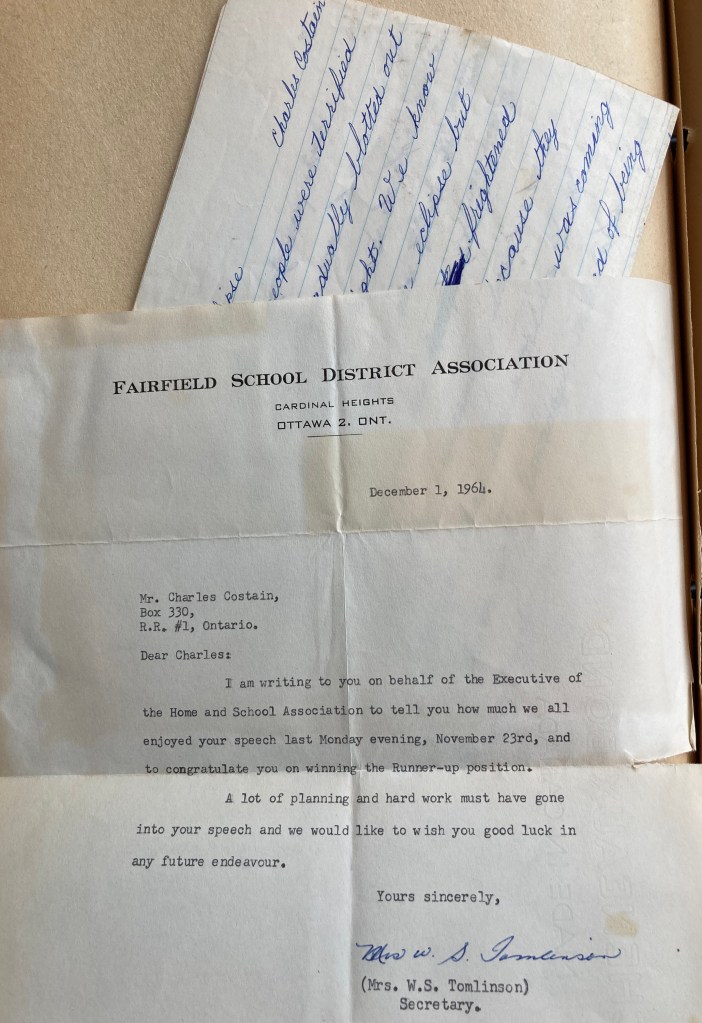 In Grade 8, Charlie was once more in the Speech Contest, with his account of the eclipse that the family had witnessed the year before, and this time he was runner-up to the winner. The Eclipse Charles Costain In ancient times, people were terrified when the sun was gradually blotted out and day turned into night. We know now that it is just an eclipse but people used to be frightened when this happened, because they thought that the world was coming to an end. Nowadays instead of being terrified, people are fascinated to watch such an interesting event. We are not taken by surprise because scientists can tell just where and when it is going to happen. The last total eclipse predicted was on July 20, 1963. We were driving back from Quebec City and went off the main road to a farmhouse, and asked the farmer if we could set up our telescope. He said that we could, and we were soon ready for it. In a while, we could see a small black bite out of the sun, and it began getting a bit darker. Slowly the sun was covered and I realized that the birds had all gone back to their nests, and there was a hush that made me shiver. The eclipse was nearly total when suddenly a cloud drifted over the sun, and no matter how hard we looked, we could not see the total eclipse. The farmer and his wife who were inside watching television probably got a better view than we did because there were no clouds at Grandmère where the television cameras were but at least we made an effort to see the real thing. We soon were packing the telescope and getting ready to leave content, but rather disappointed at not seeing it all. The speech went on to a more scientific discussion, and ended with the news of Prime Minister Pearson’s funding of a second telescope to be built in British Columbia in honour of the Queen’s visit, to be the second largest in the world. Since this was where our uncle, Carman Costain, worked, I’m sure it was good news in Penticton.