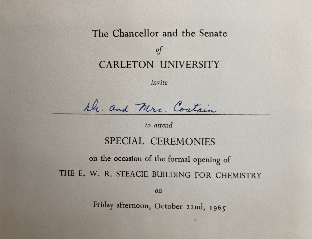 Also of note to the N.R.C. was when Dr. Steacie, the President of the N.R.C. from 1952 until his death in 1962 who had introduced the Postdoctorate Fellowship program, was honoured by Carleton University that fall when their new Chemistry building was named after him. The Herzbergs and N.R.C. staff were happy with this recognition.