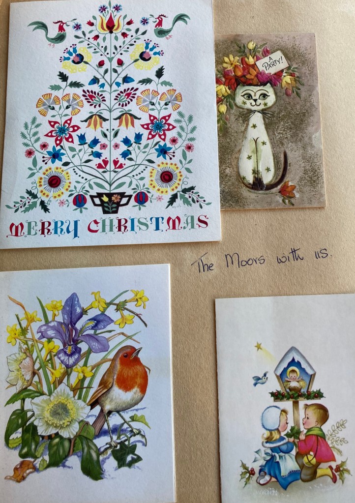 The entries for ‘Presents Sent’ and ‘Received’ and ‘Cards Sent’ for 1965 in Cyn’s ancient Agenda Book are the last lists. The records of Christmas from 1932 to 1965 filled a years’ worth of pages, and the actual 1965 gifts give a picture of the time- Cec got a Harry Belafonte record and fondue forks from the family, Cyn a projector for those slides, and both children got English Annuals from their Grannie this time- which they enjoyed, but now are very much of that time- not PC at all, in fact, offensive in many ways. Linda got more books, of course, including the next hardback in the Little House series she was collecting, and Charlie a Gloucester High School sweater. And with the Christmas cards received, the Costains got the usual adorable photos of their friends’ growing families.