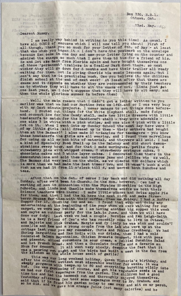 Well, Linda kept you posted on my progress – or non-progress, but at last I have begun your letter! Last week I was very disorganized as Cec went to the Canadian Association of Physicists Meeting at Sherbrooke, Quebec, on Wed. afternoon, and Lindy and Charlie had exams last week and we were all at 6es and 7s! Neither of them had to sit all the exams, they got recommended in most things, but Lindy had to write three and decided to write English too, and see if she could improve her mark, and Charlie was recommended in everything, but had some marks in the 60s so decided to take those exams and see if he could improve them. He got recommended in Math. with a mark of 88 but took the exam to see if he could get his mark up to 90, but he doesn’t think that he made it! Some of the exams were in the morning and some in the afternoon and other days they didn’t have to go at all, so with Cec away we slept late in the mornings and everything was in a muddle. Cec came home on Sat. evening, and this morning I was so unaccustomed to the routine that I slept in until 8:20! Linda and Charlie both have an exam tomorrow morning and then they are finished for the summer and are feeling very sorry for the poor little kids at Fairfield who begin exams today and have another 2 weeks of school. I am so sorry that I have been such a long time in writing. Of course when I am determined to write a long letter, I always seem to put it off until I have a longer time, and it gets later and later. Linda has just come down in her bathing suit – it is a glamorous new 2 piece in navy and white and she looks very cute in it. We are having a roasting day today – well over 80 but quite a nice breeze – and last week after a very hot spell that finished off the lilac and tulips in short order it got so cold and when Cec was away we had to put on the furnace it was so cold and rainy a couple of days. I feel virtuous because I went out and gardened all morning, we are having a very bad year for mosquitoes so I haven’t been doing as much as I should, but this morning I covered myself with mosquito dope and went out and fixed up the small bed at the back just along the side of the garage you know. Do you remember Pat gave me some little plants last year that made quite pretty little green bush-like clumps which turned red in the Fall? It is called coxchia but I don’t know how to spell it! Anyway that whole bed was covered with seedlings so that it looked as if it were growing pale green moss. So this morning I transplanted some to the back of the other bed by the patio and wherever I wanted them and then dug all the rest up. I have planted nasturtium seeds along the front and then lots of my geranium slips and up the back some chrysanthemum plants which I had from a pot of chrysanthemums in the house. I have also planted a clematis plant at the back, with some strings to climb up to the garage roof so I am hoping that when next you come I will have a beautiful clematis vine! I planted all my patience plants out in the front last week and I have planted marigolds in the front bed where I had petunias last year. Cec has put cement curbs all along the sides of the driveway, and he has got some flat square cement paving stones and he has made a path from the front path to the door onto the porch, along in front of the garbage cans! The curbs give it a nice finished appearance, and we laugh, because Marjorie Graham keeps remarking about how nice they are and how she wishes they could get some, and she is still talking about the container for the garbage cans, so Cec says Dick must dread driving past our house! Do you remember Charlie’s rose? Well, it looked very dead this spring and we were sure that it was winter killed, so about two weeks ago we dug it up and of course we then found one tiny shoot on it still alive, so had to plant it hastily once more! We thought that we had probably finished it, but it seems to have done it good and it has quite a few shoots now and it’s looking quite healthy. We bought a Centennial Rose, which by the pictures looked very pretty and it is growing well, and I hope that we will have some lovely Centennial roses. Last time that I wrote was just before we had the second of our two big buffet dinners, on Friday 27th May. It went very well – we had June and George Lindsay among others – I felt very guilty as we hadn’t had them for so long, but George has been down in Kingston this year taking some high-powered course and only home for weekends, so it was hard to organize anything. George was on top of his form and telling funny stories and Linda thought he was very funny. He isn’t as terrified of her now that she is no longer a tiny baby! Anyway, after that was over, I thought oh, goody, a quiet week – I’ll get some sewing done, so on Monday I cut out 2 dresses for Linda – the yellow one she is making for herself, but I began the pale blue one, then on the Tuesday I went to the bank and grocery shopping and all the odds and ends I do when I have the car, and then about 4 o’clock, the children were home from school and I had just put all the food away when the phone rang and a man’s voice said hello and who should it be but Alan Jaeger! [Cyn’s first cousin once removed, son of her New York cousin Margs.] I was completely amazed as I had no idea Alan ever thought of coming up here but it turned out that he had a week’s unexpected holiday and he decided to come to see Canada. I discovered all this and that he was on his own and had settled in a Motel on the Montreal Rd. so I invited him for dinner and told him how to get to our house. I can tell you I scuttled around because we had been going to have hamburger and so I dashed to the store again and got a roast of beef and some strawberries and everything was in control when he arrived at 6:15. He was very nice – Both Cec and I thought that he had improved since we met him at Mill and Ford’s camp that time, bu