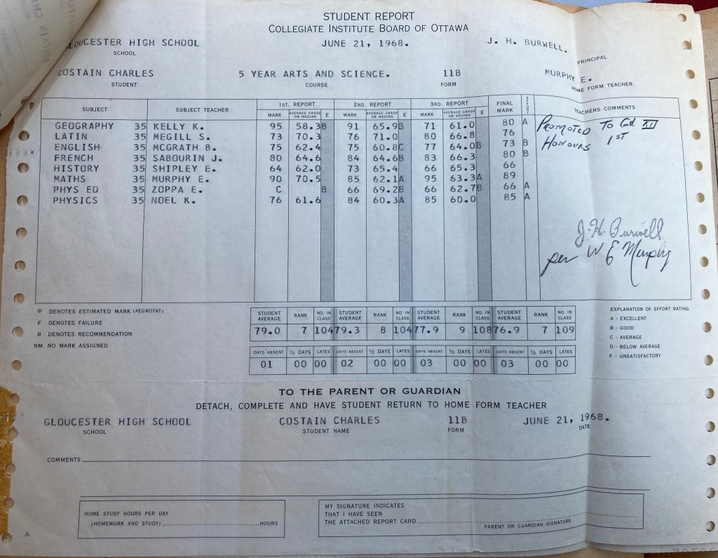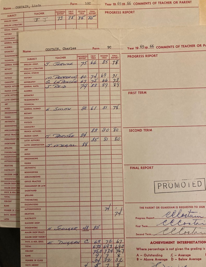The regular demands of the school year carried on: classes, homework, written exams three times a year, and the marks that resulted. Linda and Charlie and their friends participated in what interested them, bought ice cream sandwiches in the cafeteria to augment their bag lunches, and did well in classes, being promoted in June to Grades 11 and 12.