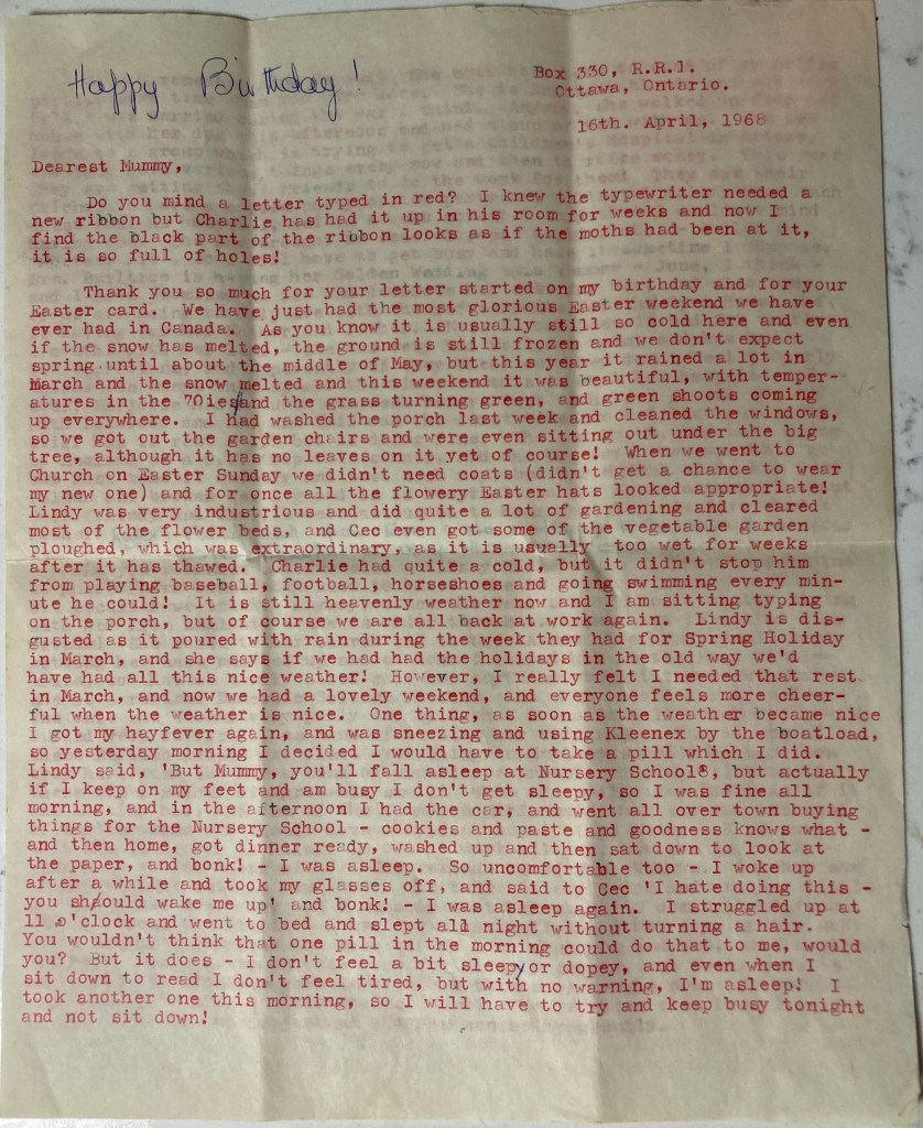 Dearest Mummy, Do you mind a letter typed in red? I knew the typewriter needed a new ribbon but Charlie has had it up in his room for weeks and now I find the black part of the ribbon looks as if the moths had been at it, it is so full of holes! Thank you so much for your letter started on my birthday and for your Easter card. We have just had the most glorious Easter weekend we have ever had in Canada. As you know it is usually still so cold here and even if the snow has melted, the ground is still frozen and we don’t expect spring until about the middle of May, but this year it rained a lot in March and the snow melted and this weekend it was beautiful, with temperatures in the 70s and the grass turning green, and green shoots coming up everywhere. I had washed the porch last week and cleaned the windows, so we got out the garden chairs and were even sitting out under the big tree, although it has no leaves on it yet of course! When we went to Church on Easter Sunday we didn’t need coats (didn’t get a chance to wear my new one) and for once all the flowery Easter hats looked appropriate! Lindy was very industrious and did quite a lot of gardening and cleared most of the flowerbeds, and Cec even got some of the vegetable garden plowed, which was extraordinary as it is usually too wet for weeks after it has thawed. Charlie had quite a cold, but it didn’t stop him from playing baseball, football, horseshoes and going swimming every minute he could! It is still heavenly weather now and I am sitting typing on the porch, but of course we are all back at work again. Lindy is disgusted as it poured with rain during the week they had for Spring Holiday in March, and she says if we had had the holidays in the old way we’d have had all this nice weather! However, I really felt I needed that rest in March, and now we had a lovely weekend, and everyone feels more cheerful when the weather is nice. One thing, as soon as the weather became nice I got my hay fever again, and was sneezing and using Kleenex by the boat load, so yesterday morning I decided I would have to take a pill which I did. Lindy said, “But Mummy, you’ll fall asleep at Nursery School, but actually if I keep on my feet and I’m busy I don’t get sleepy, so I was fine all morning, and in the afternoon I had the car, and went all over town buying things for the nursery school – cookies and paste and goodness knows what – and then home, got dinner ready, washed up and then sat down to look at the paper, and bonk! – I was asleep. So uncomfortable too – I woke up after a while and took my glasses off, and said to Cec “I hate doing this – you should wake me up” and bonk! – I was asleep again. I struggled up at 11 o’clock and went to bed and slept all night without turning a hair. You wouldn’t think that one pill in the morning could do that to me, would you? But it does – I don’t feel a bit sleepy or dopey, and even when I sit down to read I don’t feel tired, but with no warning, I’m asleep! I took another one this morning, so I will have to try and keep busy tonight and not sit down! Do you remember Edna Renaud? She must have been to some of my coffee parties sometime when you were here. She is English, blonde and not very tall – was married during the war I think. Anyway, she walked up from her house with her dog this afternoon and had a cup of tea with me. She belongs to a group which is trying to get a Children’s Hospital in Ottawa, and they have various things every now and then to raise money. This year they are getting their friends to do the work for them! They ask their friends to have a coffee party or tea party and collect one dollar from each guest for the hospital, and in a weak moment I said I wouldn’t mind having one. She has brought me special paper napkins etc.- called a ‘Hostess Kit’, so I will have to get busy and have it sometime I suppose. [It was built by the time I was teaching in the 70s- I substituted there when unemployed.]