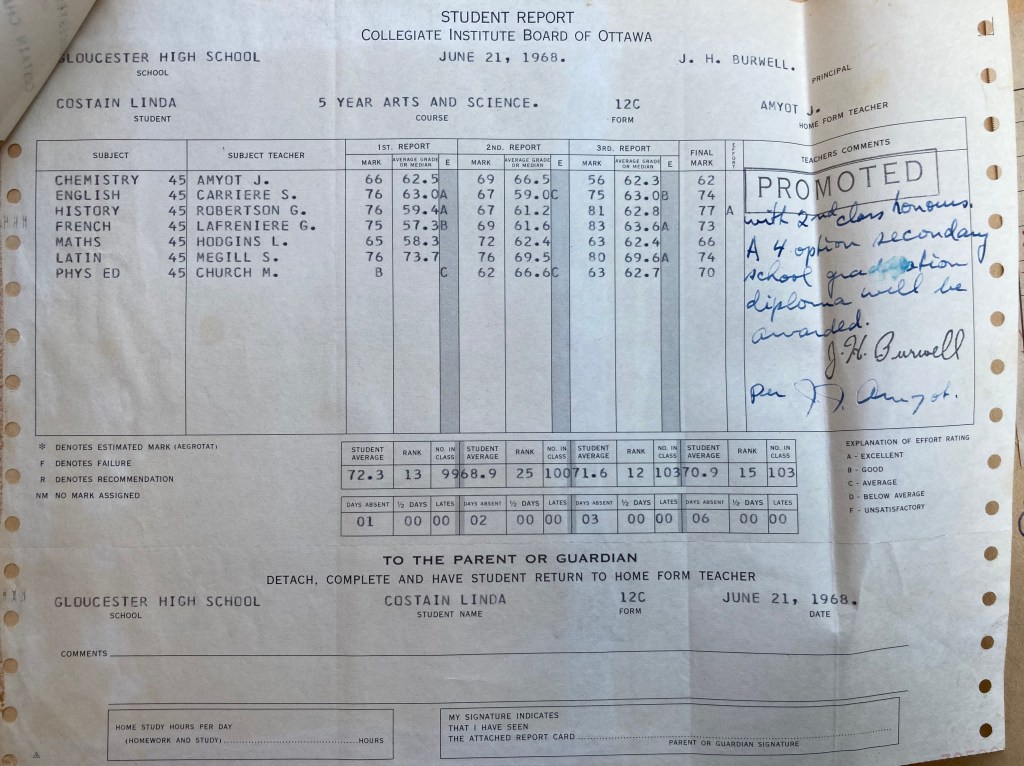 The fall of 1964 was fun for Linda- she enjoyed high school: the increased independence, the variety of interesting classes and teachers, the library and cafeteria, and new friends- although the number of students took a while to get used to. Her marks remained good although she attempted without much success to follow her mother’s profession by taking Home Economics as an elective- making a blue flannel shift to wear in Sewing, and producing a sad liquid soup that should have been a chocolate pudding in Foods, which seemed to be more about the costing of the dishes than actually making them. She found learning Latin was more interesting.