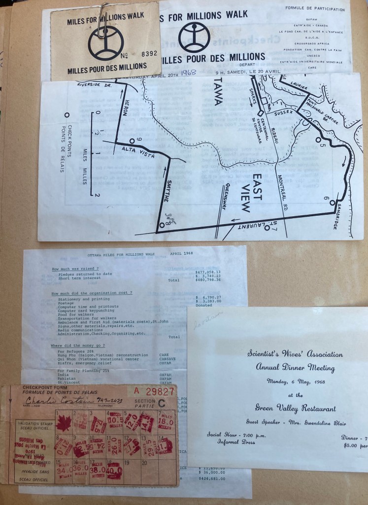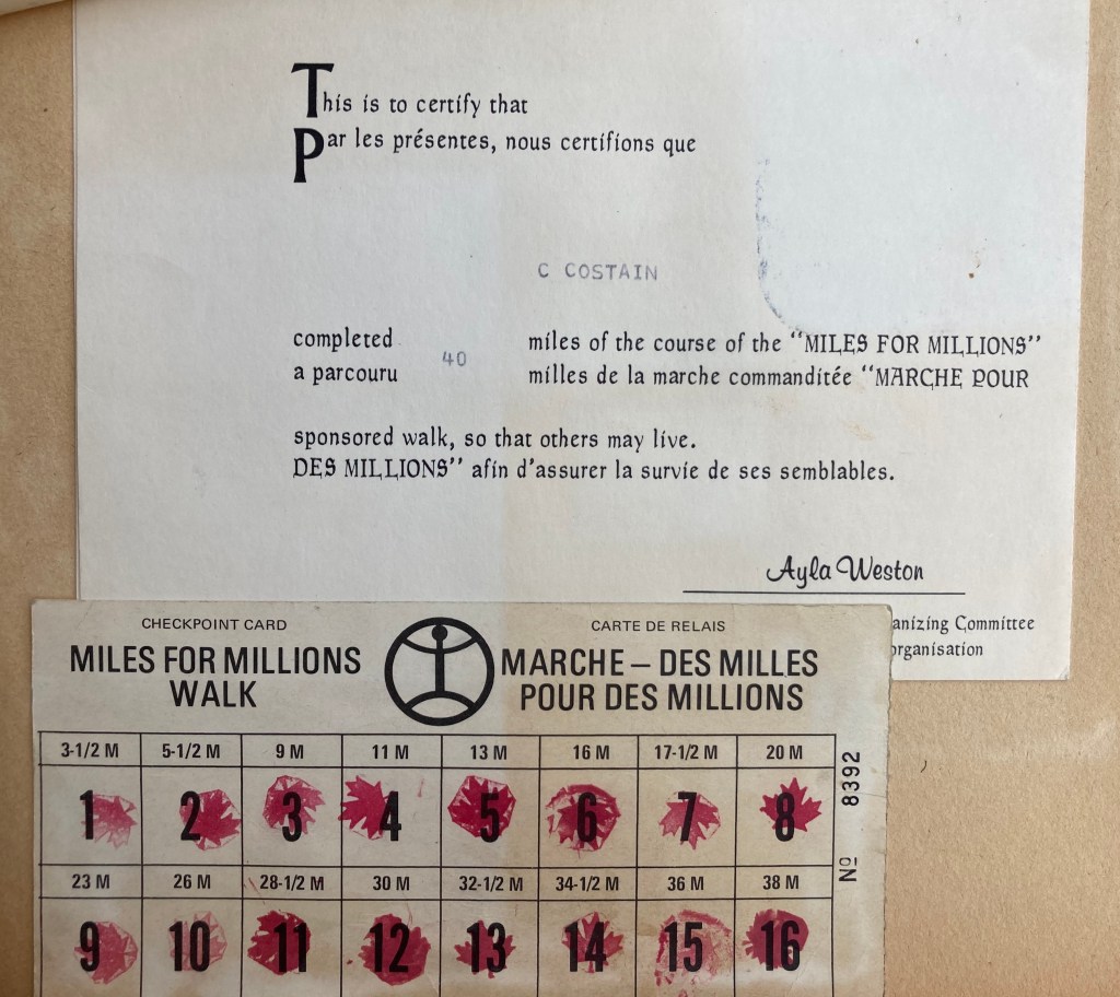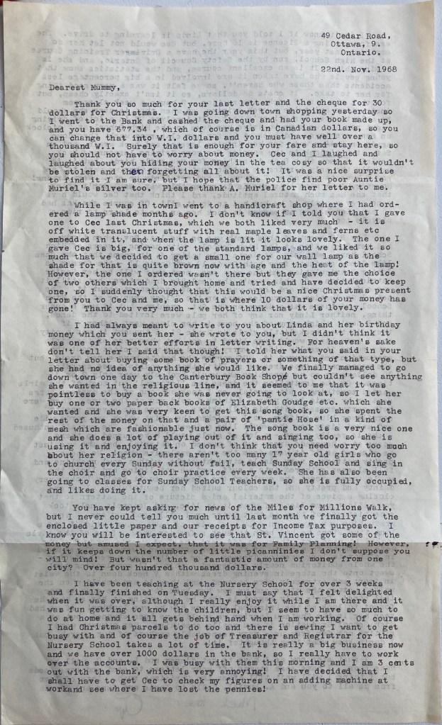 You have kept asking for news of the Miles for Millions Walk, but I never could tell you much until last month we finally got the enclosed little paper and our receipts for income tax purposes. I know you will be interested to see that St. Vincent got some of the money but amused I expect, that it was for Family Planning! But wasn’t that a fantastic amount of money from one city? Over four hundred thousand dollars. I have been teaching at the Nursery School for over 3 weeks and finally finished on Tuesday. I must say that I felt delighted when it was over, although I really enjoy it while I am there and it was fun getting to know the children, but I seem to have so much to do at home and it all gets behind hand when I am working. Of course I had Christmas parcels to do too and there is sewing I want to get busy with and of course the job of Treasurer and Registrar for the Nursery School takes a lot of time. It is really a big business now and we have over 1000 dollars in the bank, so I really have to work over the accounts. I was busy with them this morning and I am 3 cents out with the bank, which is very annoying! I have decided that I shall have to get Cec to check my figures on an adding machine at work and see where I have lost the pennies!