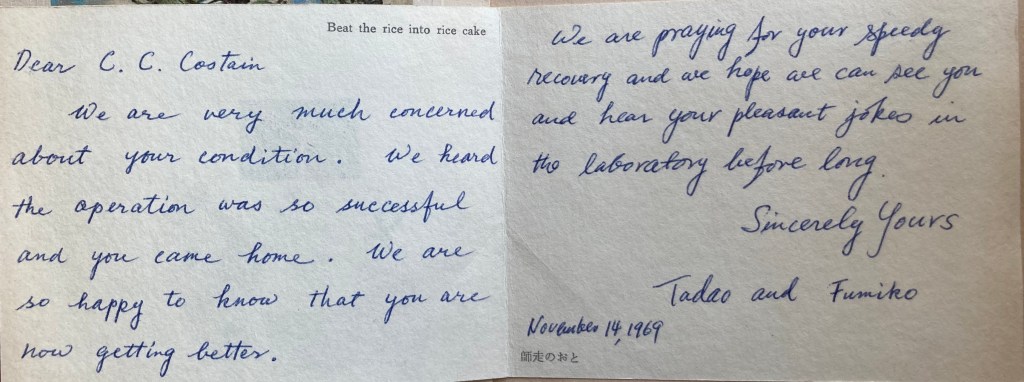 At the N.R.C. Cec was happy to welcome the Dr. and Mrs. Morino from Japan who had both come to spend a year in the Lab. They were very kind to the children and shared aspects of their culture with us. Cyn kept the charming ‘Thank You’ notes they sent after social events, and pasted the kanji that I assume were their names into the scrapbook. Dear Dr. & Mrs. Costain, Just a short note to thank you for giving us such a nice party. Everything about it was wonderful. Sincerely, Yonezo & Yoshi.