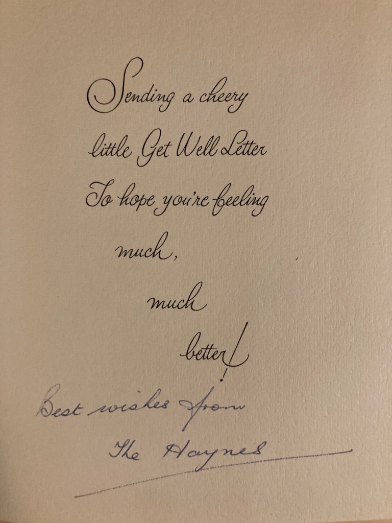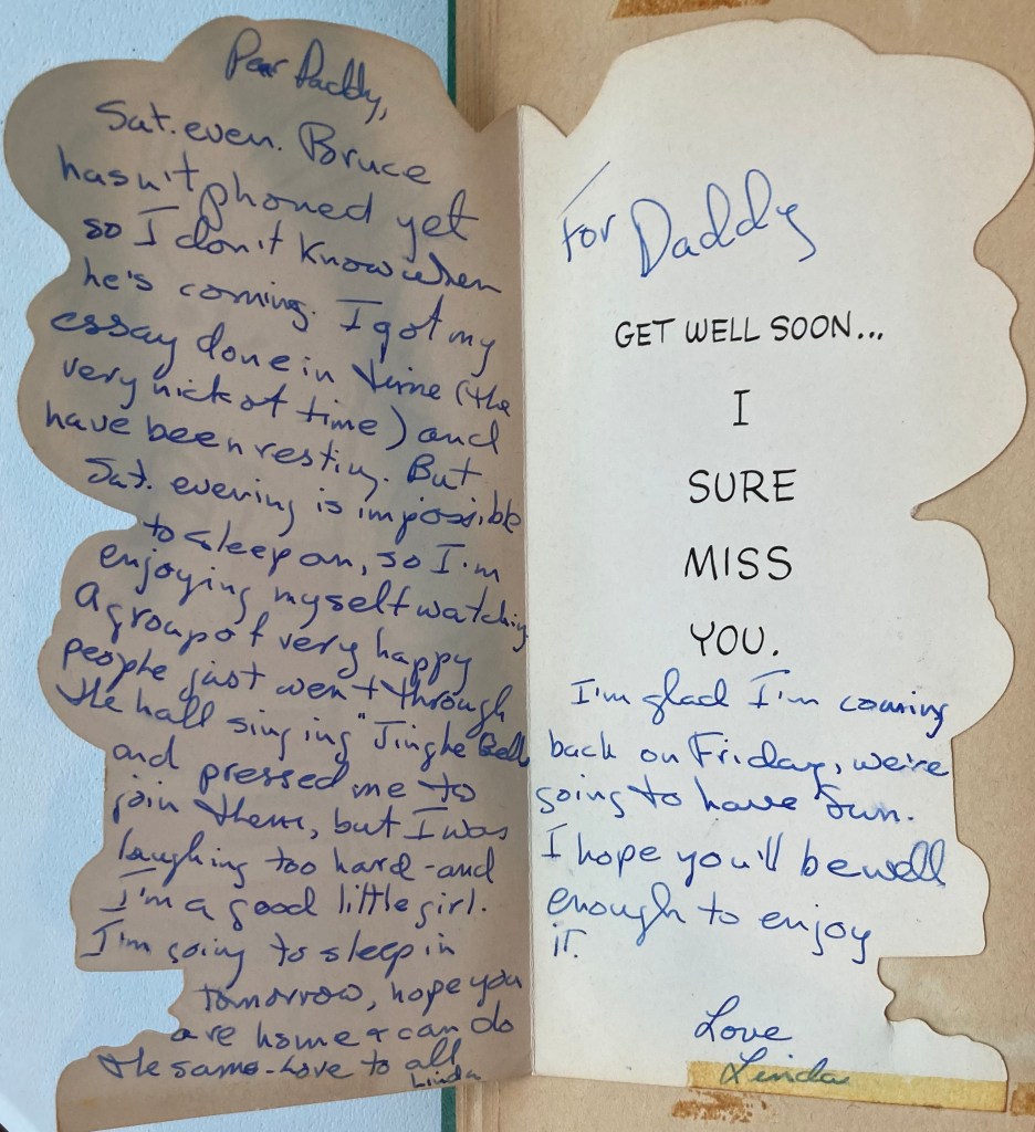 Dear Daddy, Sat. even. Bruce hasn’t phoned yet, so I don’t know when he’s coming. I got my essay done in time (the very nick of time) and have been resting. But Sat. evening is impossible to sleep on, so I’m enjoying myself watching a group of very happy people just went through the hall singing “Jingle Bells” and pressed me to join them, but I was laughing too hard- and I’m a good little girl. I’m going to sleep in tomorrow, hope you are home & can do the same. Love to all. Linda Card Page: For Daddy Get Well Soon… I Sure Miss You. I’m glad I’m coming back on Friday, I’m going to have fun. I hope you’ll be well enough to enjoy it. Love Linda