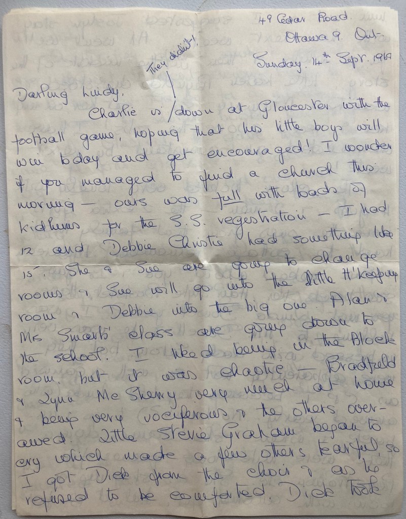 … I’m just watching the antics of a couple of squirrels in a tree far away, but I can see their silhouettes clearly the darling jumpy things. I’m sorry I didn’t get anything written at the Moors but I had a fabulous weekend & I loved it & them & I want to go back soon! On Friday night [Hallowe’en] we kept answering the doorbell & then the kids [Bruce’s small nieces, Debbie and Cyndie] walked in & fooled me – Trick or Treat Brucie – and marched past us before I knew what was coming off. Then they stayed a bit & then Merle remembered that it was graduation at B.C.I. & so we went & I felt awfully out of place among the formals, but Bruce showed me around the high school & it was quite fun. The next morning we went into Hamilton because Bruce had to move to another room so I helped him & then he showed me around Mac [McMaster university, Bruce was in second year.] & it was raining. Then we came back & did nothing & worked. The Lornes came to dinner & it was funny especially Cyndie & her food. After they left me & Bruce went on working, but Sophocles bored me & his math prob. wouldn’t come out so we gave up & made popcorn & watched T.V. Well, on Sunday I went to a Baptist church, and although we missed the first bit, it was very interesting, and a change. In the afternoon we went over to Lorne’s & Liz & Cyndie went to Glenhurst, but Lorne made me & Debbie tea, and he & Bruce played the piano. After dinner, Uncle Dix & Bruce drove me into Toronto and put me on the bus & went, Bruce was being dropped off in Hamilton on the way back. Bruce had his Mac jacket on & the girl I sat with thought he was my boyfriend & told me all about Homecoming weekend (which she had gone to with her boyfriend). She chatted on for a bit & then tried to sleep, but I had my light on & there was a baby which cried all the time, so she didn’t succeed. Then I shared a taxi with another girl & got here, was greeted exuberantly, fell into bed & slept till noon today. I’m phoning you tonight & will be home soon Love Linda