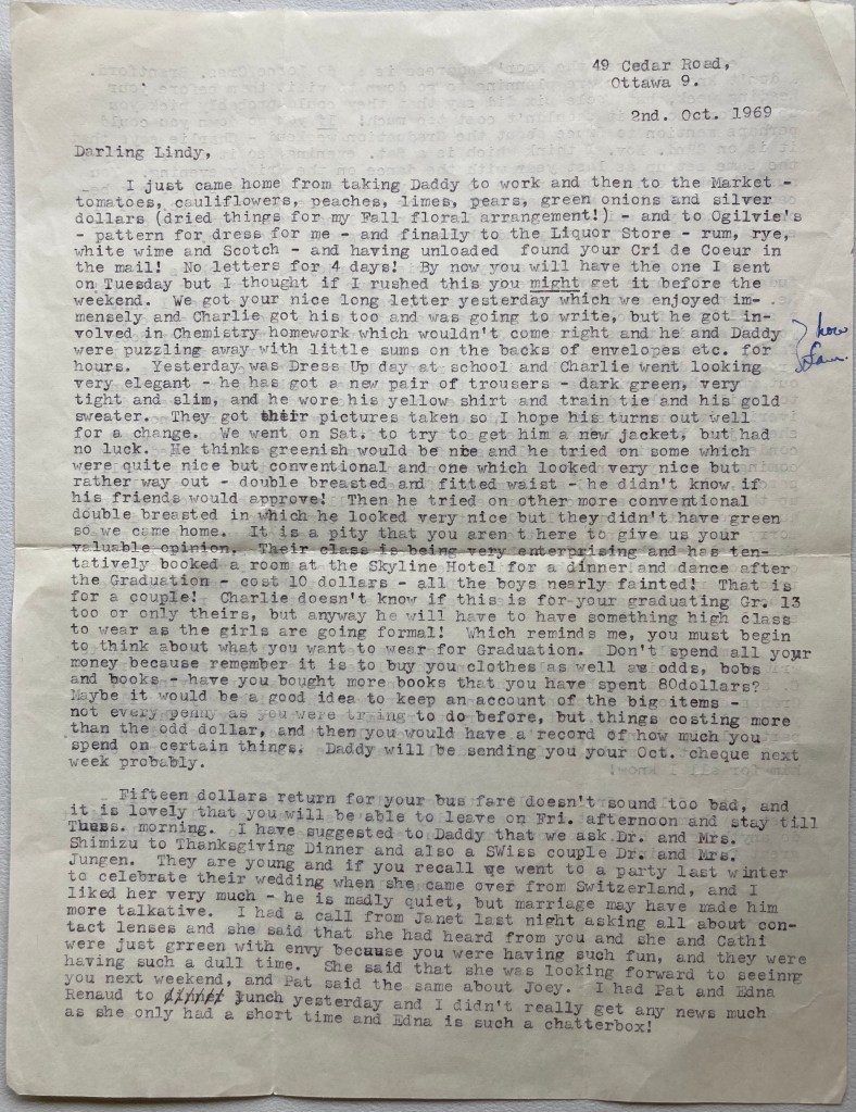 As an addendum, here is a letter from Linda at university (missing the first page) written at the beginning of November, after the weekend she spent visiting her Auntie Merle and Uncle Dix and cousin Bruce in Brantford.