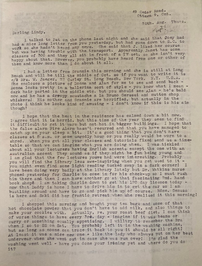 I had a letter from Lindy this morning when I got yours, and poor child, for the first time she was fed up. Some bright sparks had decided to wreck her room as a joke and had not only stripped her bed but hidden an essay she was working on and various other jolly little things, so she was mad and quite upset about it. Very juvenile behaviour and of course Lindy never has had to deal with this practical joke business before, but living with a bunch of girls this sort of silly thing always comes up, and she will just have to learn to live with it. She had recovered by the time she finished her letter – I think that she was more upset because her two particular friends were away for the weekend and she didn’t have anyone to grumble to, but anyway she will have lots of friends this weekend because I think I told you that Janet and Joanne are driving down to see her tonight. They called in last night, all excited, to collect what they call a CARE parcel – goodies!