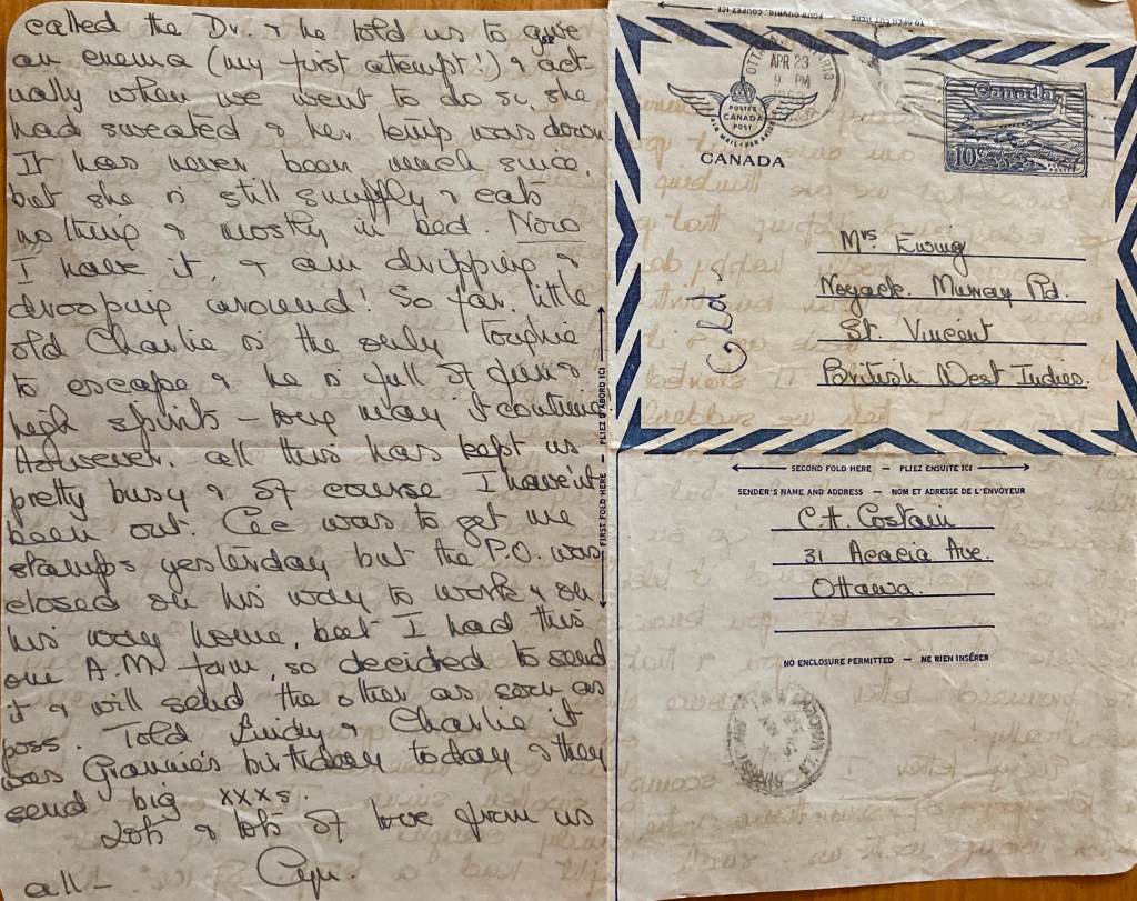 2021’s letters will focus on my parents’ daily life in the Ottawa of the 1950s, bringing up 2 small children and interacting with friends and relations. Some of the mundane details interested me- the furnace that had to be stoked daily with coke in the Ottawa winter: $200.00, as compared to the cost of a beef heart from the butcher: 25¢! But of equal interest, I think, is the personality of the writer, Cyn, as revealed by these letters to her mother- her humour, her self-awareness, her closeness to her mother, her happiness in the life she was living, and What a Good Mother she was! (I may be biased.) This 18 page epic is an entertaining start to what we all hope will be a happier year in our present, and readers of this blog are invited to follow the Costains through their (spoiler alert- happy!) life as my brother and I grow.