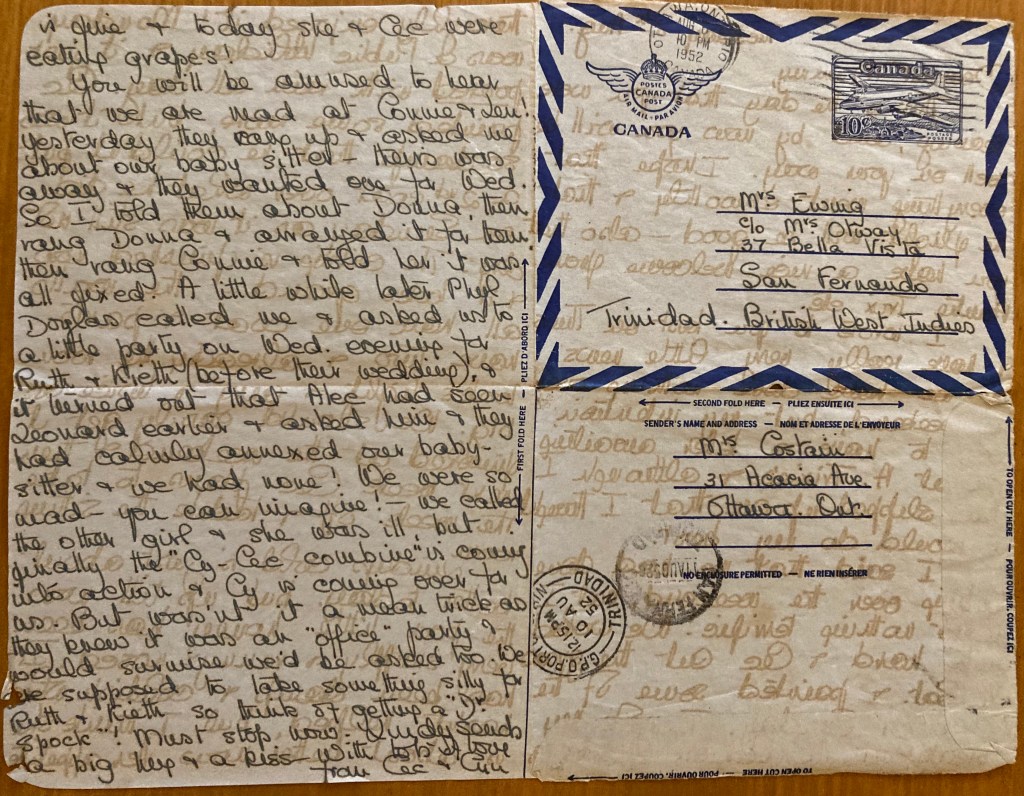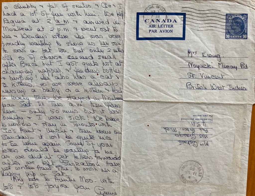 This first letter after a year’s gap is written the day after Carol left Ottawa, travelling to a series of visits on her way home. After almost a year of living with Cec and Cyn and helping look after her beloved grandchild, it must have been a wrench leaving, even if she was going to other loving relatives.