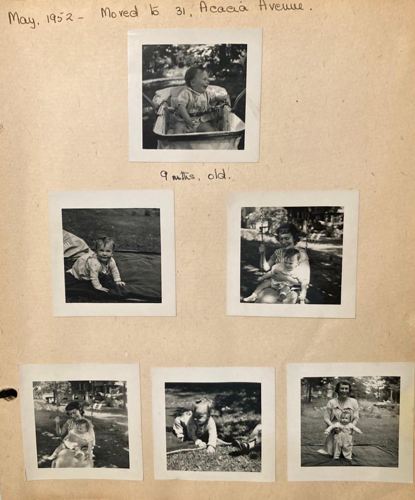 In March a Get Well card in the scrapbook suggests that Cyn had German measles, fortunately a month before she became pregnant again. Her birthday in April was celebrated and then they MOVED- two sets of rent in the accounts, and the mover’s fee- to Acacia Avenue, still in the same area of Ottawa, but closer to the wealthy houses in Rockcliff, with a conclave of NRC families close by. It was half a duplex, and the photos show the baby, now crawling, with grass with trees and swings available, something I’m sure Cec and Cyn had been looking for.