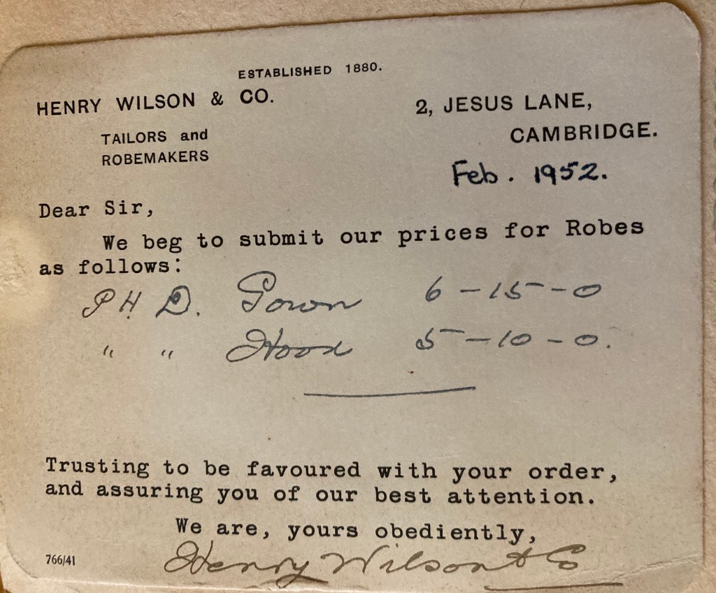 Although I don’t think Cec ordered them, the Tailors and Robemakers’ price for a PhD. Gown and Hood from Cambridge confirms that Cec’s degree had been granted. Dr. C.C.Costain certainly looks delighted, holding his daughter. The February accounts show that Cyn’s money from England finally had been transferred, and they were able to get ‘Cec’s Insurance’ $95.35 (Canada did not have medical care then), splurge on Cec’s clothes, make several withdrawals of ‘Cash’ and pay Carol back $200 for loans made in Ann Arbor and during the move.