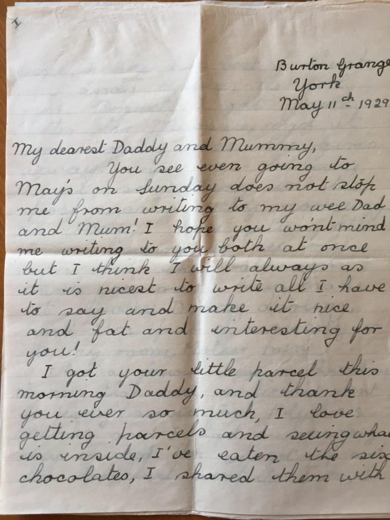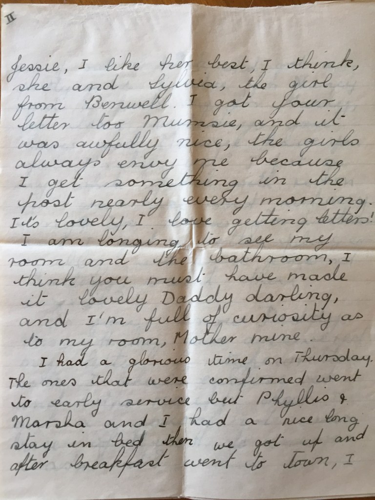 I got your little parcel this morning Daddy, and thank you ever so much, I love getting parcels and seeing what is inside, I’ve eaten the six chocolates, I shared them with Jessie, I like her best, I think, she and Sylvia, the girl from Benwell. I got your letter too Mumsie, and it was awfully nice, the girls always envy me because I get something in the post nearly every morning. It’s lovely, I love getting letters! I am longing to see my room and the bathroom, I think you must have made it lovely Daddy darling, and I am full of curiosity as to my room, Mother mine.