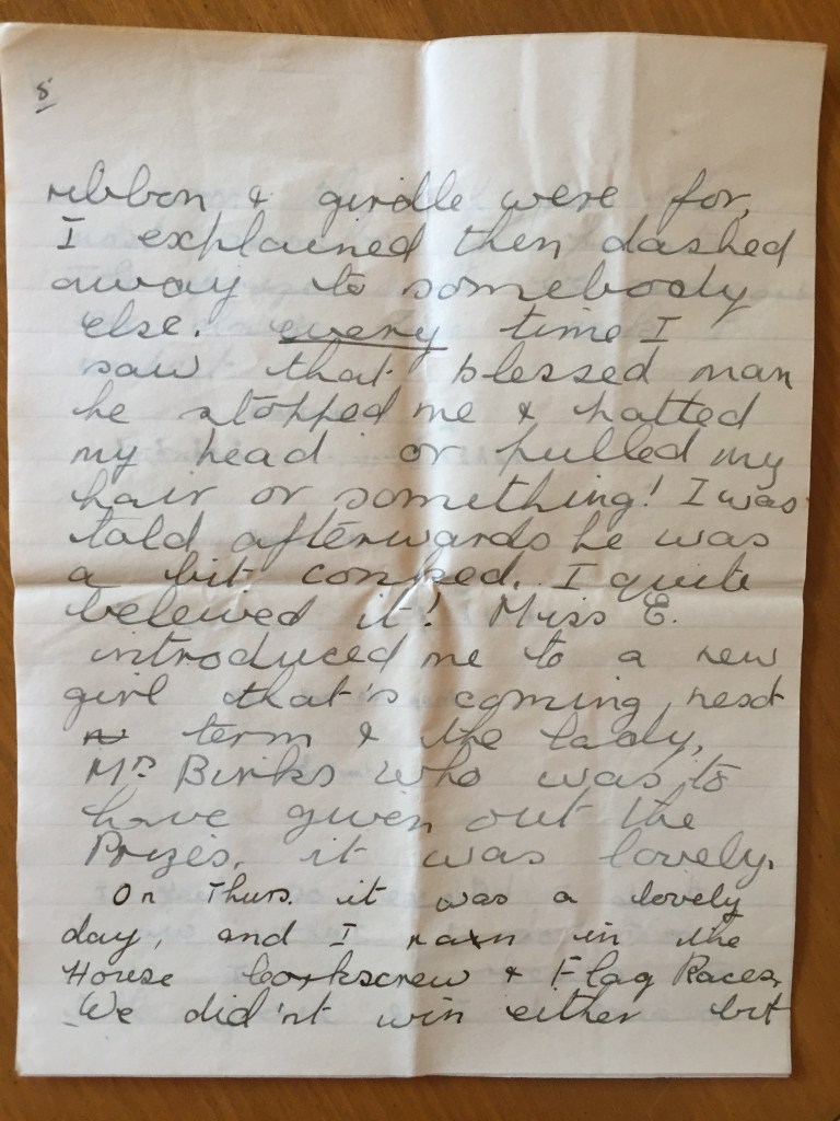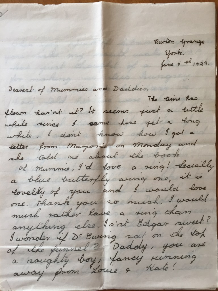 I think I’m getting on quite well here my darlings and I’m awfully happy, nearly everyone likes me I think & the mistresses are all jolly decent to me. Mrs. P and Miss J. are both golapious & I feel so happy, oh parents mine!
