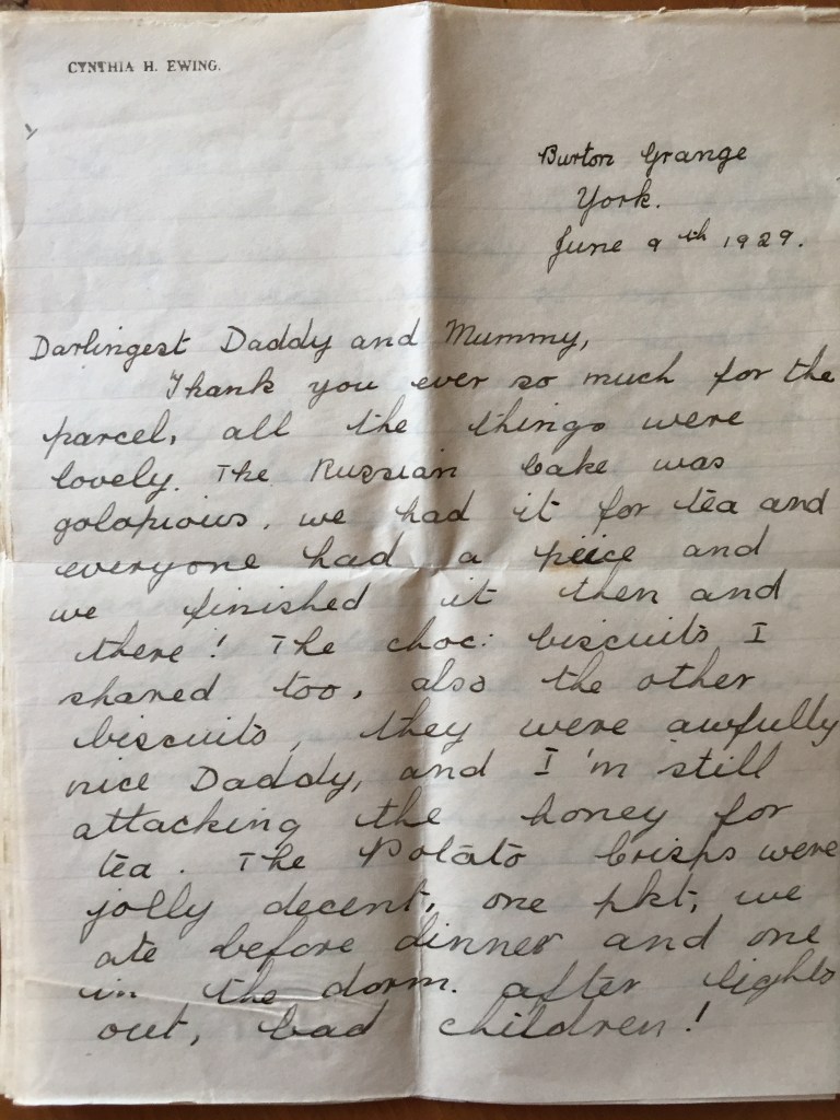Thank you ever so much for the parcel, all the things were lovely. The Russian cake was golopious, we had it for tea and everyone had a piece and we finished it then and there! The choc: biscuits I shared too, also the other biscuits, they were awfully nice daddy, and I’m still attacking the honey for tea. The Potato Crisps were jolly decent, one pkt, we ate before dinner and one in the dorm. after lights out, bad children!