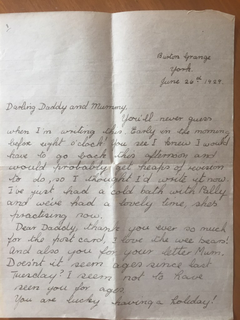 You’ll never guess when I’m writing this. Early in the morning before 8 o’clock! You see I knew I would have to go back this afternoon and would probably get heaps of revision to do, so I thought I’d write it now. I’ve just had a cold bath with Pally and we had a lovely time, she’s practising now.