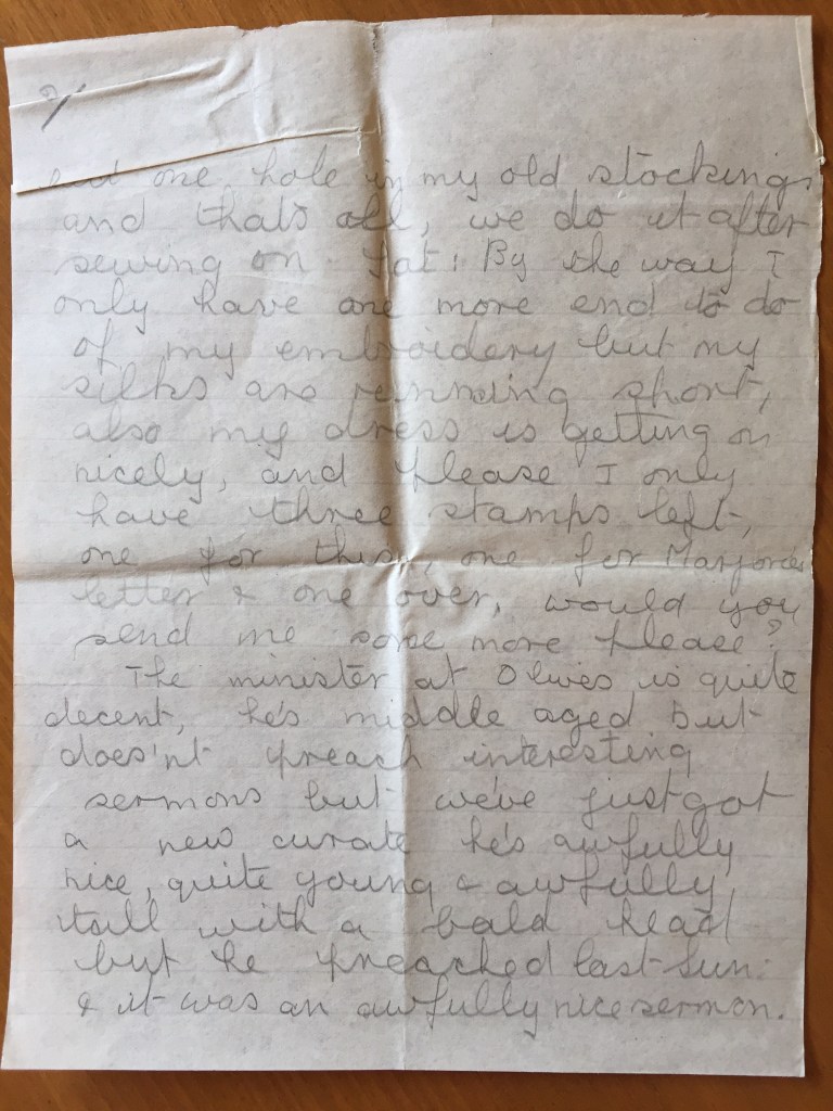 The minister at Olives is quite decent, he’s middle-aged but doesn’t preach interesting sermons but we’ve just got a new curate he’s awfully nice, quite young and awfully tall with a bald head but he preached last Sun: and it was an awfully nice sermon.