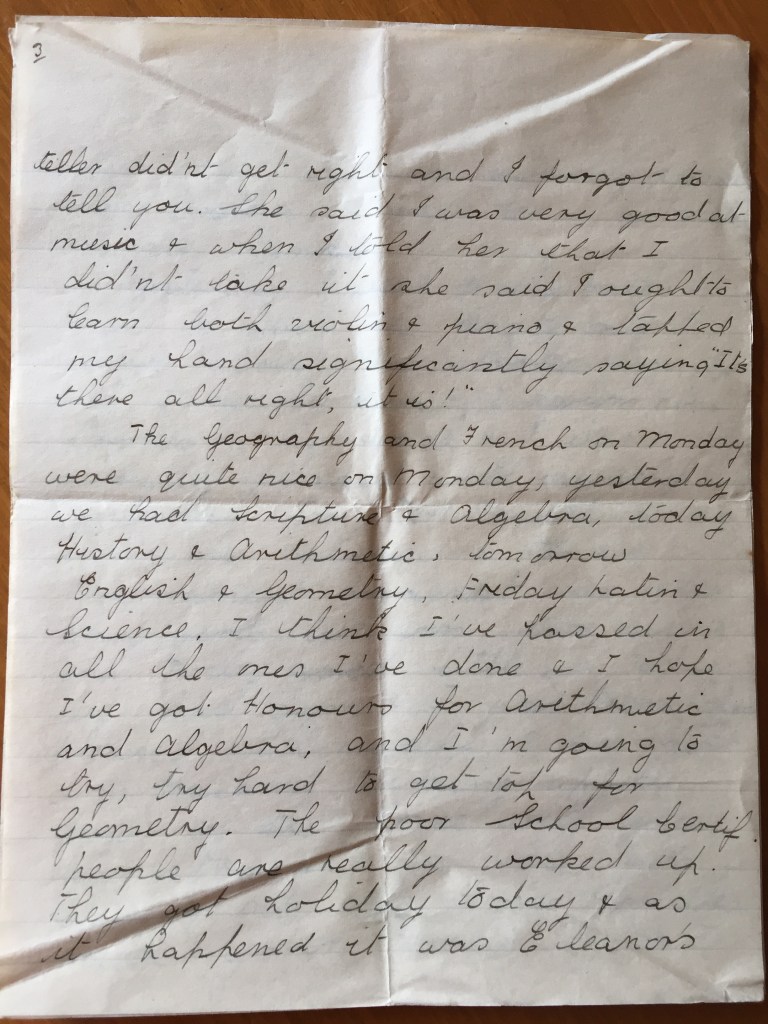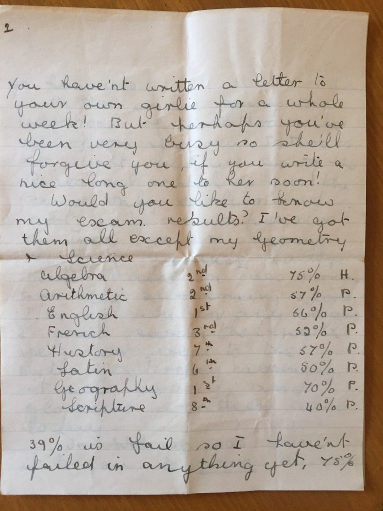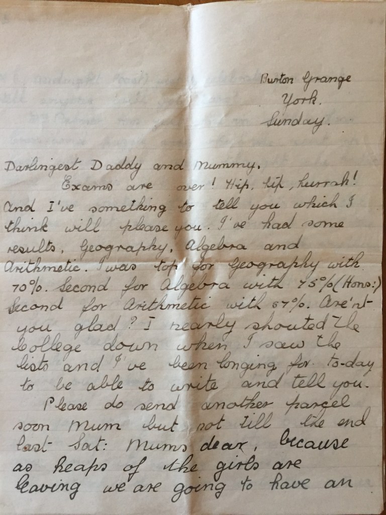 Exams are over! Hip, hip, hurrah! And I’ve something to tell you which I think will please you. I’ve had some results, Geography, Algebra and Arithmetic. I was top for Geography with 70%. Second for Algebra with 75% (Hons:) Second for Arithmetic with 57%. Aren’t you glad? I nearly shouted the College down when I saw the lists and I’ve been longing for to-day to be able to write and tell you.