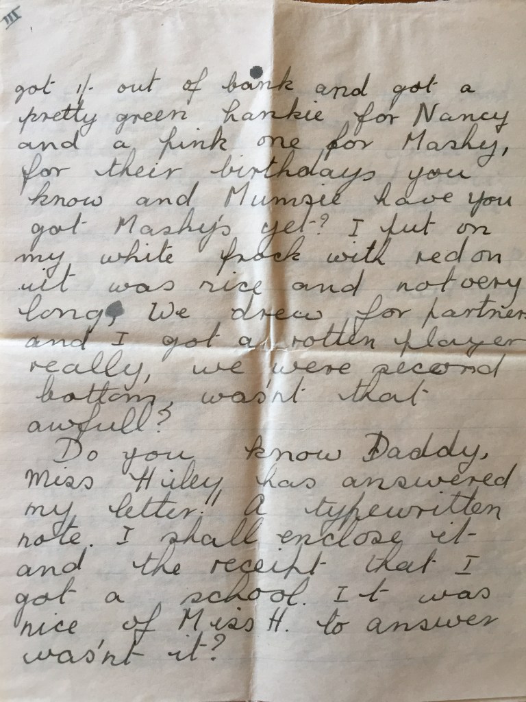 I had a glorious time on Thursday. The ones that were confirmed went to early service but Phyllis and Marsha and I had a nice long stay in bed then we got up and after breakfast went to town, and I got 1/- out of bank and got a pretty green hankie for Nancy and a pink one for Mashy, for their birthdays you know and Mumsie have you got Mashy’s yet? I put on my white frock with red on it was nice and not very long. We drew for partners and I got a rotten player really, we were second bottom, wasn’t that awful?