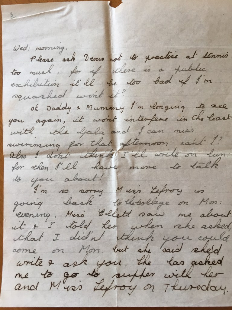 Oh Daddy and Mummy I am longing to see you again, it won’t interfere in the least with the Gala and I can miss swimming for that afternoon can’t I? Also I don’t think I’ll write on Sun: for then I’ll have more to talk to you about!