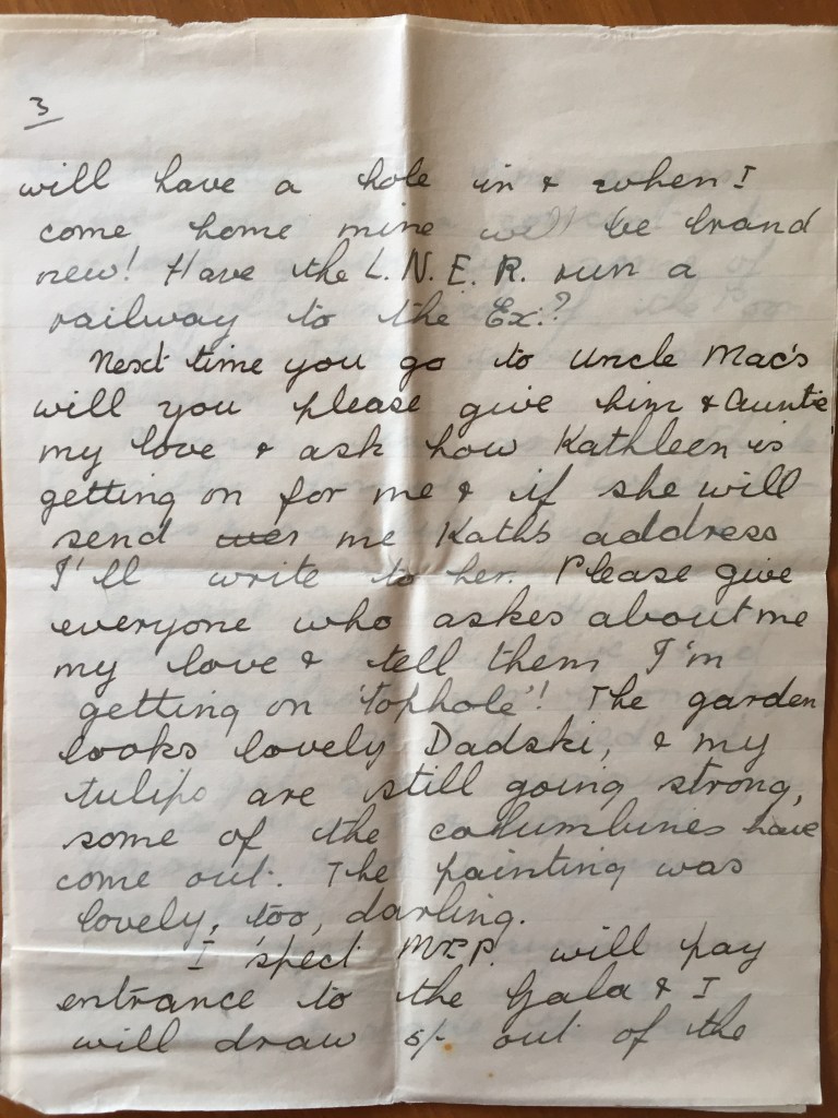 Next time you go to Uncle Mac’s will you please give him and auntie my love & ask how Kathleen is getting on for me & if she will send me Kath’s address I’ll write to her. Please give everyone who askes about me my love and tell them I’m getting on ‘tophole’! The garden looks lovely Dadski, & my tulips are still going strong, some of the columbine have come out. The painting was lovely, too, darling.