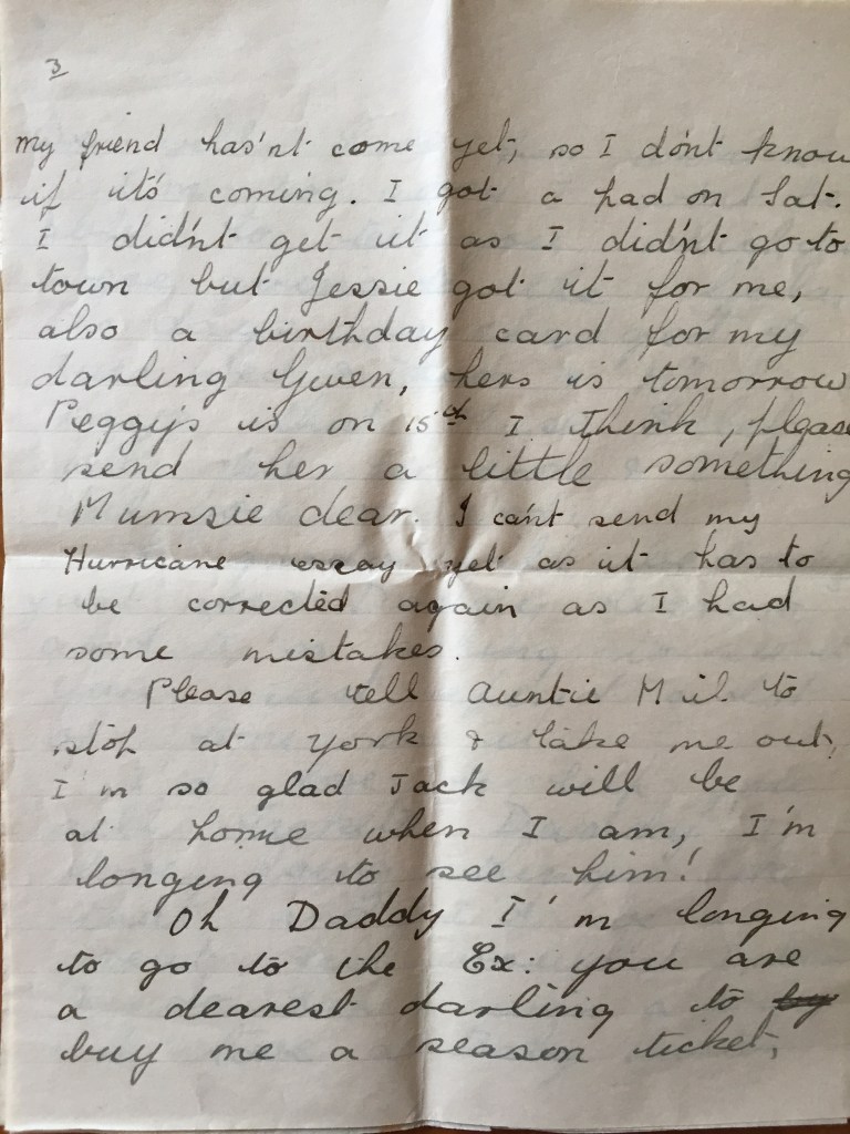 My friend hasn’t come yet, so I don’t know if it’s coming. I got a pad on Sat. I didn’t get it as I didn’t go to town but Jessie got it for me, also a birthday card for my darling Gwen, hers is tomorrow Peggy’s is on the 15th I think, please send her a little something Mumsie dear. I can’t send my Hurricane essay yet as it has to be corrected again as I had some mistakes.