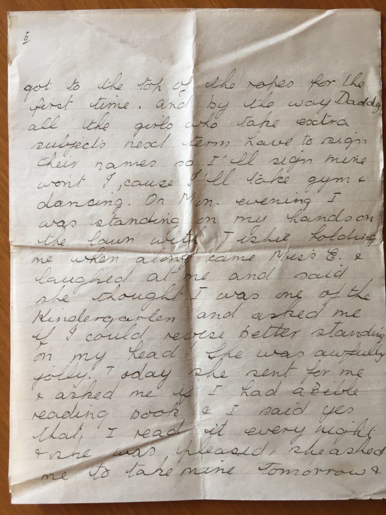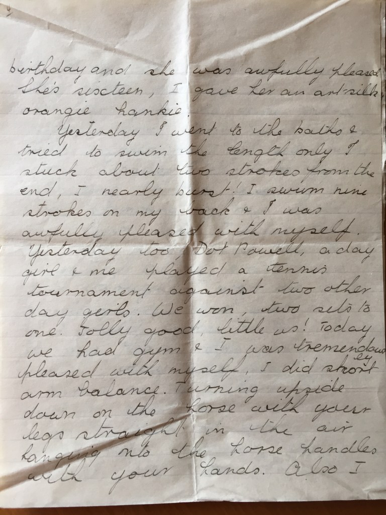 Yesterday I went to the baths & tried to swim the length only I stuck about two strokes from the end, I nearly burst! I swum nine strokes on my back & I was awfully pleased with myself. Yesterday too, Dot Powell, a day girl & me played a tennis tournament against two other day girls. We won, two sets to one. Jolly good, little us! Today we had gym & I was tremendously pleased with myself, I did short arm balance. Turning upside down on the horse with your legs straight in the air hanging onto the horse handles with your hands. Also I got to the top of the ropes for the first time, and by the way Daddy all the girls who take extra subjects next term have to sign their names so I’ll sign mine won’t I, cause I’ll take gym & dancing. On Mon. evening I was standing on my hands on the lawn with Tishie holding me when along came Miss E. & laughed at me and said she thought I was one of the Kindergarten and asked me if I could revise better standing on my head! She was awfully jolly. Today she sent for me & asked me if I had a Bible reading book & I said yes that I read it every night & she was pleased, she asked me to take mine tomorrow & show it to her so as to see if mine was better than the ones the girls have.