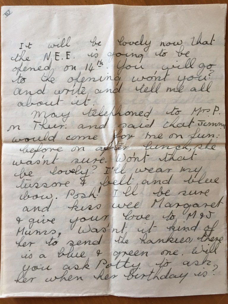 Daddy, do you think that the Sat. after I get home that Dot & Nan & Marjorie and us could all meet somewhere and go to the Ex. together it would be lovely if we could. Do you think you could ask them? I’m getting quite excited at the thought of it!