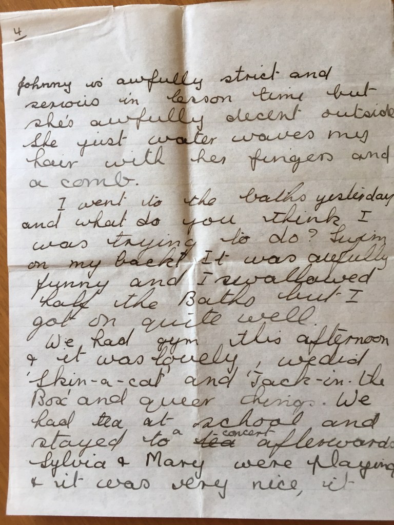 We had gym this afternoon and it was lovely, we did ‘Skin-a-cat’ and ‘Jack-in-the-Box’ and queer things. We had tea at school and stayed to a concert afterwards. Sylvia & Mary were playing & it was very nice, it was all on the piano and I got rather bored!