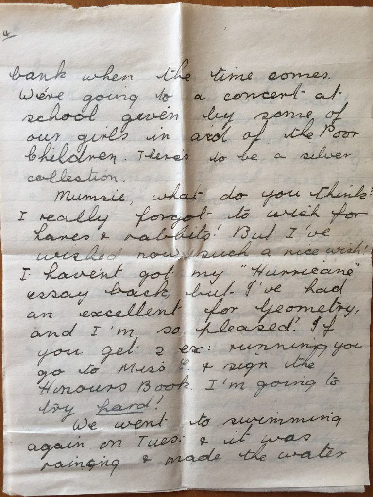 Mumsie, what do you think? I really forgot to wish for hares and rabbits! But I’ve wished now, such a nice wish! I haven’t got my ‘Hurricane’ essay back, but I’ve had an excellent for Geometry, and I’m so pleased! If you get 2 ex: running you go to Miss E. and sign the Honours Book. I’m going to try hard!