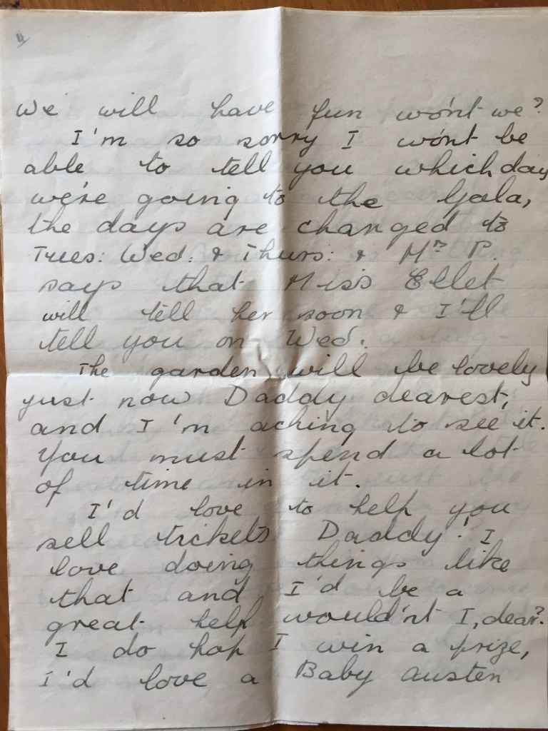 Oh Daddy! You are so kind and good to these people, I do wish I could be like you because you’ve been doing all sorts of nice kind things since I’ve been away. But when I come home I will go and see Ernest and see little Dorothy and be nice too!