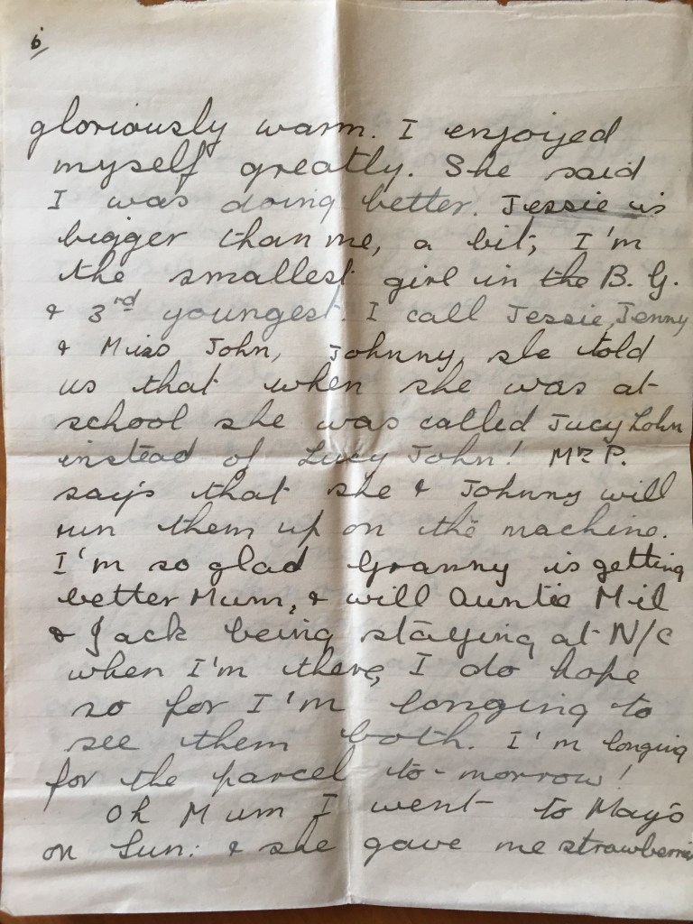 We went to swimming again on Tues: & it was raining & made the water gloriously warm. I enjoyed myself greatly. She said I was doing better. Jessie is bigger than me, a bit, I’m the smallest girl in B.G. & 3rd youngest. I call Jessie, Jenny, & Miss John, Johnny, she told us that when she was at school she was called Jucy Lohn instead of Lucy John! Mrs. P say’s that she and Johnny will run them up on the machine.