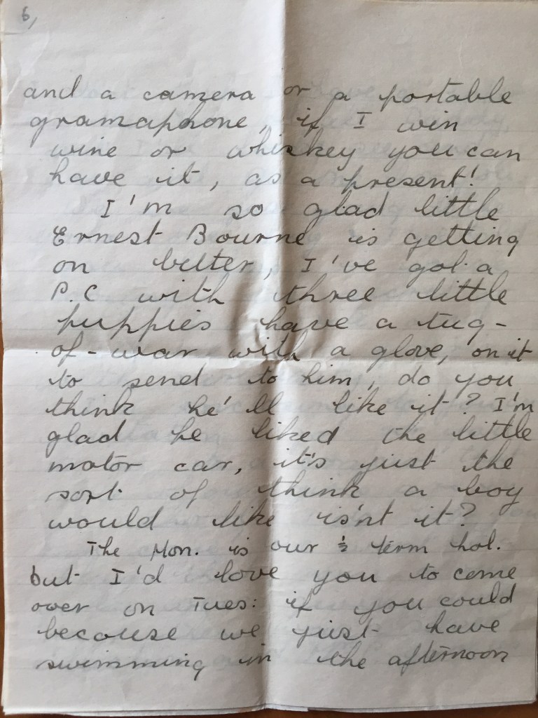 I’m so glad little Ernest Bourne is getting on better, I’ve got a P.C. with three little puppies have a tug-of-war with a glove, on it to send to him, do you think he’ll like it? I’m glad he liked the little motor car, it’s just the sort of think a boy would like isn’t it?