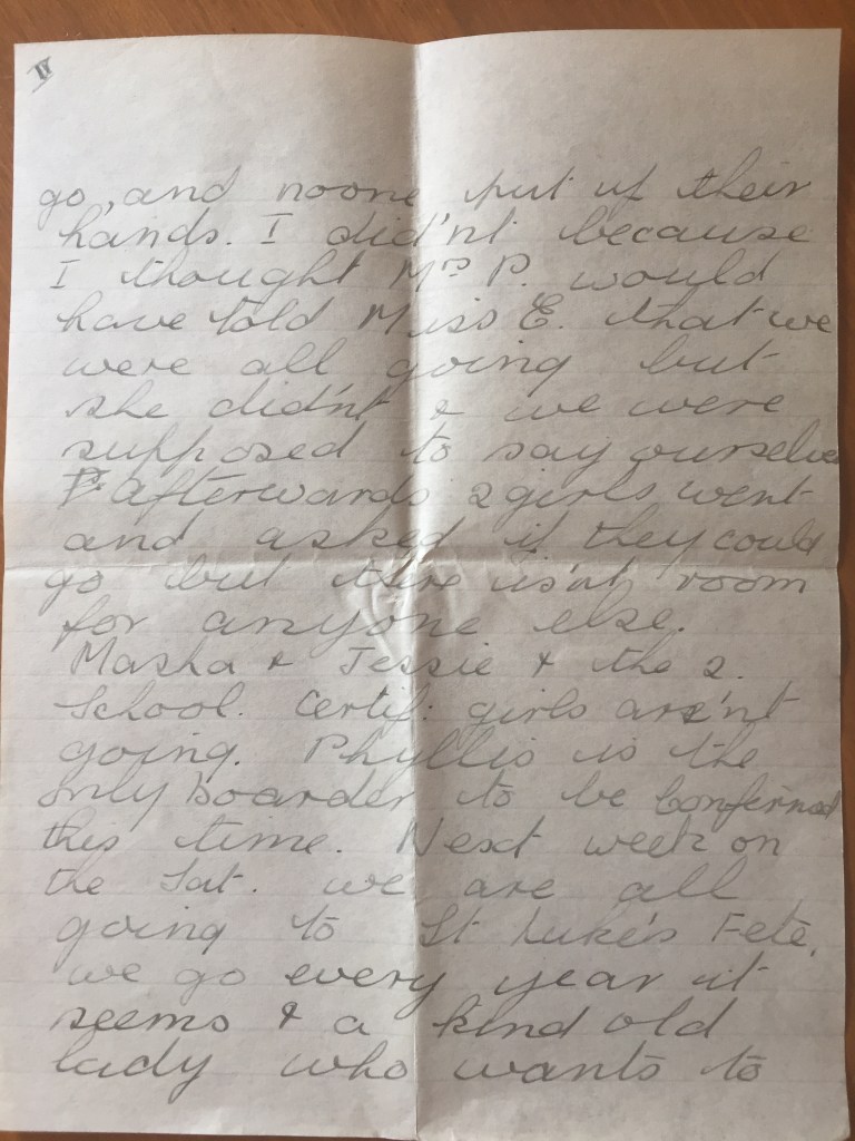 On Friday night we were all feeling silly so we all, five of us, got into one single bed! Phyllis, Jessie & Sylvia at the top, Marsha & I at the bottom! We stayed like sardines till about 11:30 then we went to our own beds! Every night Miss John does something for us, when she takes lights, she recites or dances or something she does it beautifully, we’re all convinced that she’s married to the Prince of Wales or is really an actress or something awful, she’s so mysterious. She sometime faints for us as Tessa in the “Constant Nymph’ and dies, she does it beautifully!