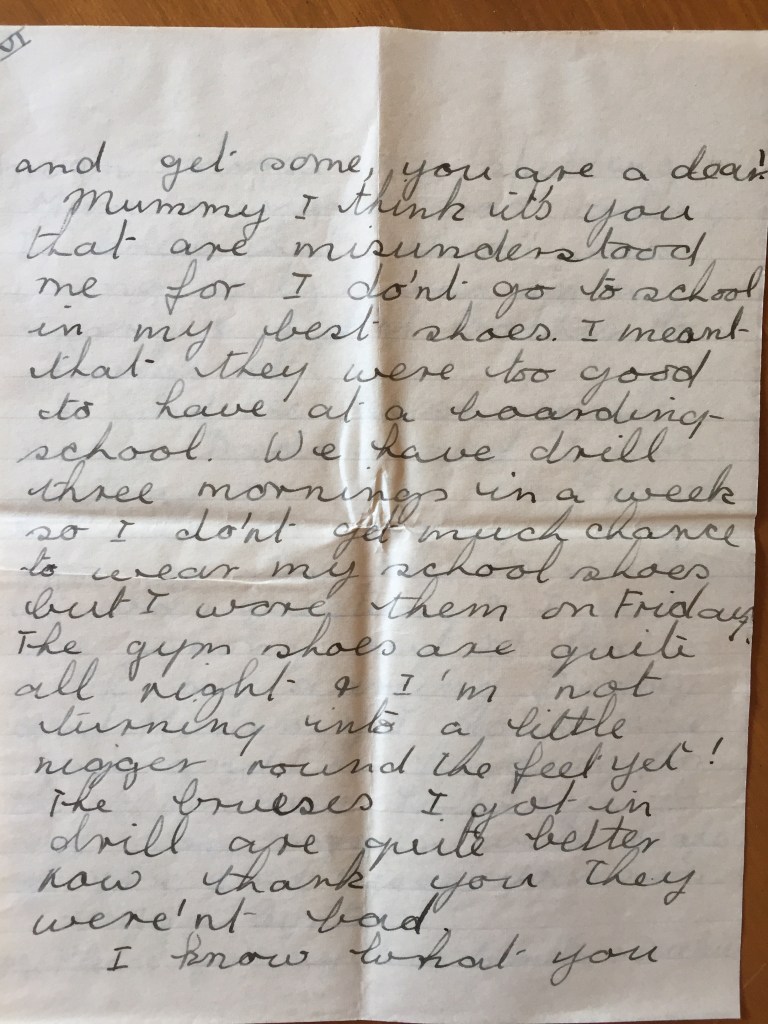 Mummy I think it’s you that are misunderstood me for I do’nt go to school in my best shoes. I meant that they were too good to have at a boarding school. We have drill three mornings in a week so I do’nt get much chance to wear my school shoes but I wore them on Friday. The gym shoes are quite all right & I’m not turning into a little nigger around the feet yet! The bruises I got in drill are quite better now thank you they were’nt bad.