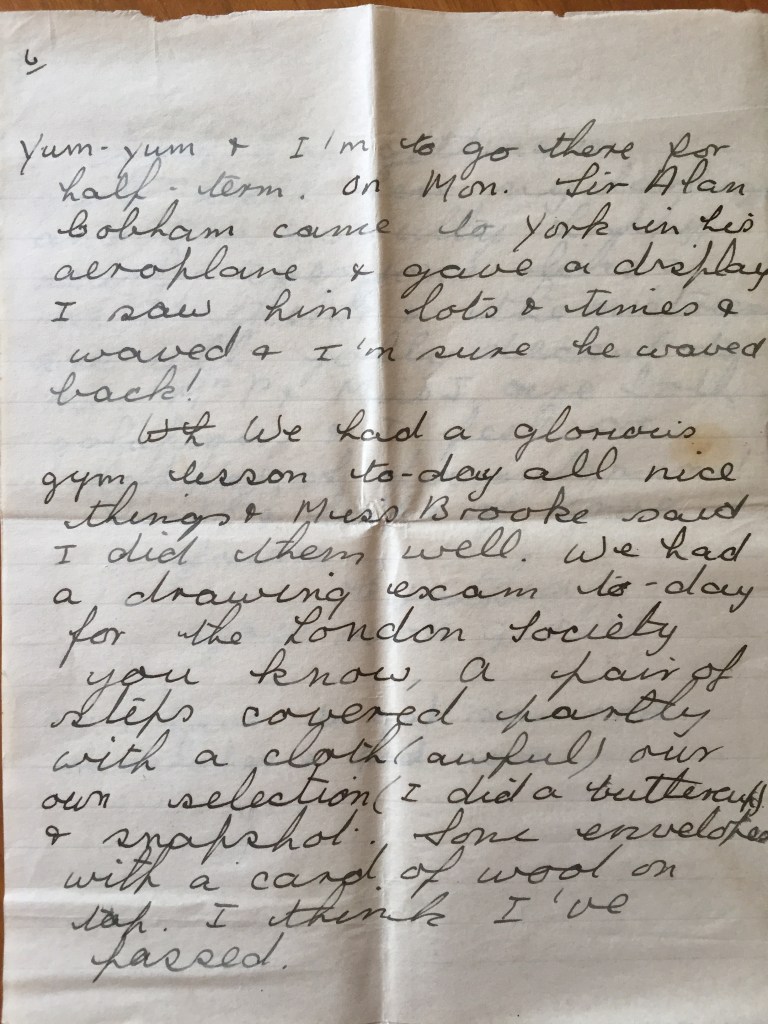 Oh Mum I went to May’s on Sun: and she gave me strawberries Yum-yum & I’m to go there for half term. On Mon. Sir Alan Cobham came to York in his aeroplane & gave a display I saw him lots o times and waved & I’m sure he waved back!